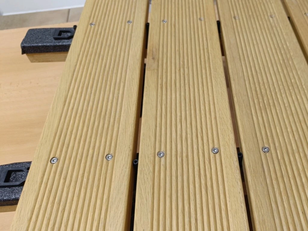 Distanční podložka z PP (polypropylen) pro dřevěné terasy se spárou 7 mm. Výrobek vám zaručí přesný spoj a spáru mezi jednotlivými terasovými prkny. Díky tloušťce podložky (6 mm) výrobek podporuje ventilaci mezi konstrukcí a samotnými terasovými prkny. Doporučení spáry podle typu terasových prken: 4 mm – pro dřevo s vlhkostí >20% 7 mm – pro dřevo s vlhkostíDoplňkové parametry