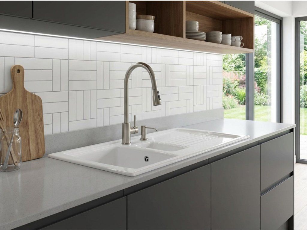- bílý keramický dřez s druhou vaničkou a odkapávačem