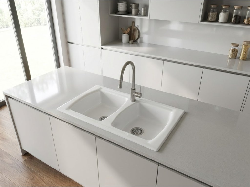 - bílá keramika, dvou komorový dřez