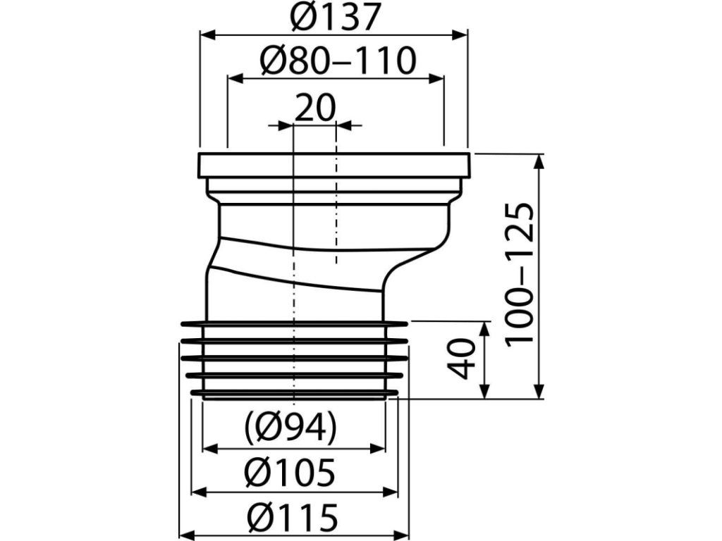 Dopojení k volně stojícímu WC, excentrické 20 mm, 110 mm, délka 125 mm, PP, bílé A991-20