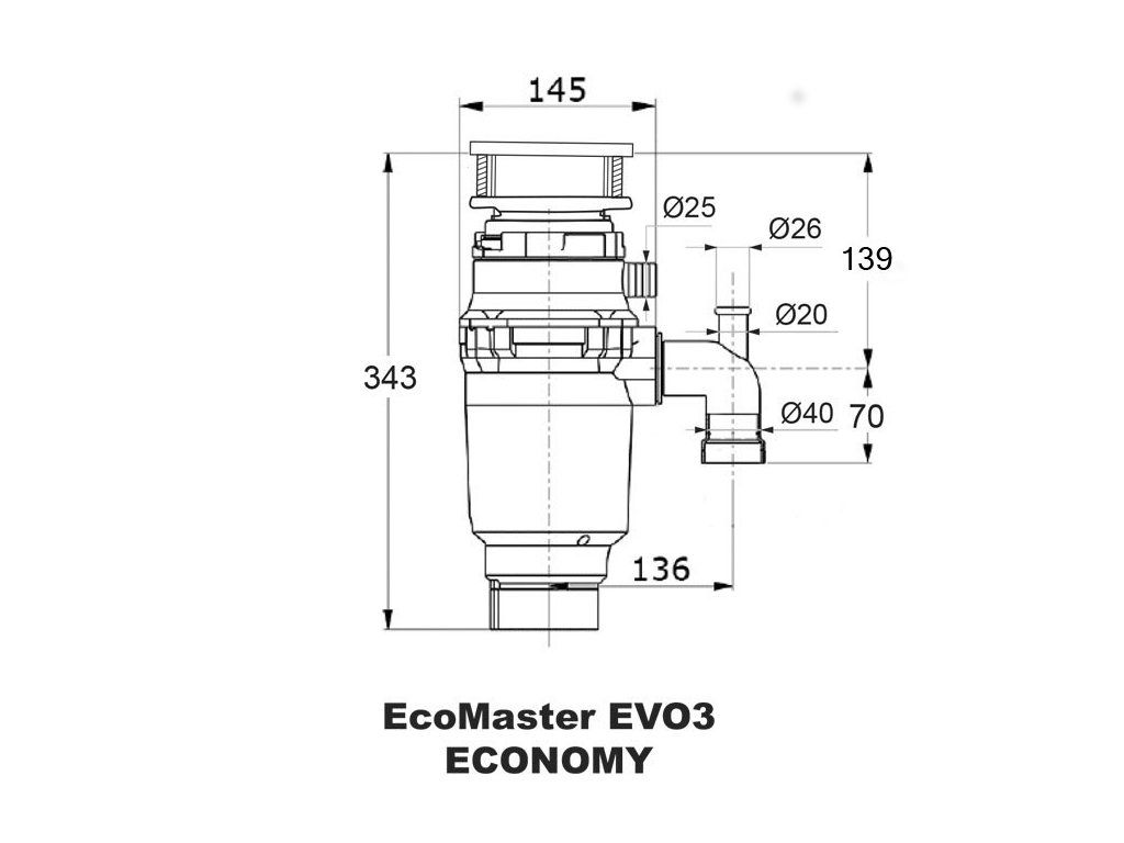 Drtič kuchyňského odpadu (potravinovych zbytku – zbytku jidla) EcoMaster Economy je základní model, určen pro menší domácnosti o 2–3 osobách. Dále vhodný pro místa, kde je nestandardní, případně omezený prostor pro montáž. Všechny drticí komponenty jsou z kvalitní nerezové oceli. Odhlučnění je provedeno překrytím motoru.