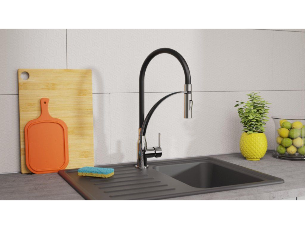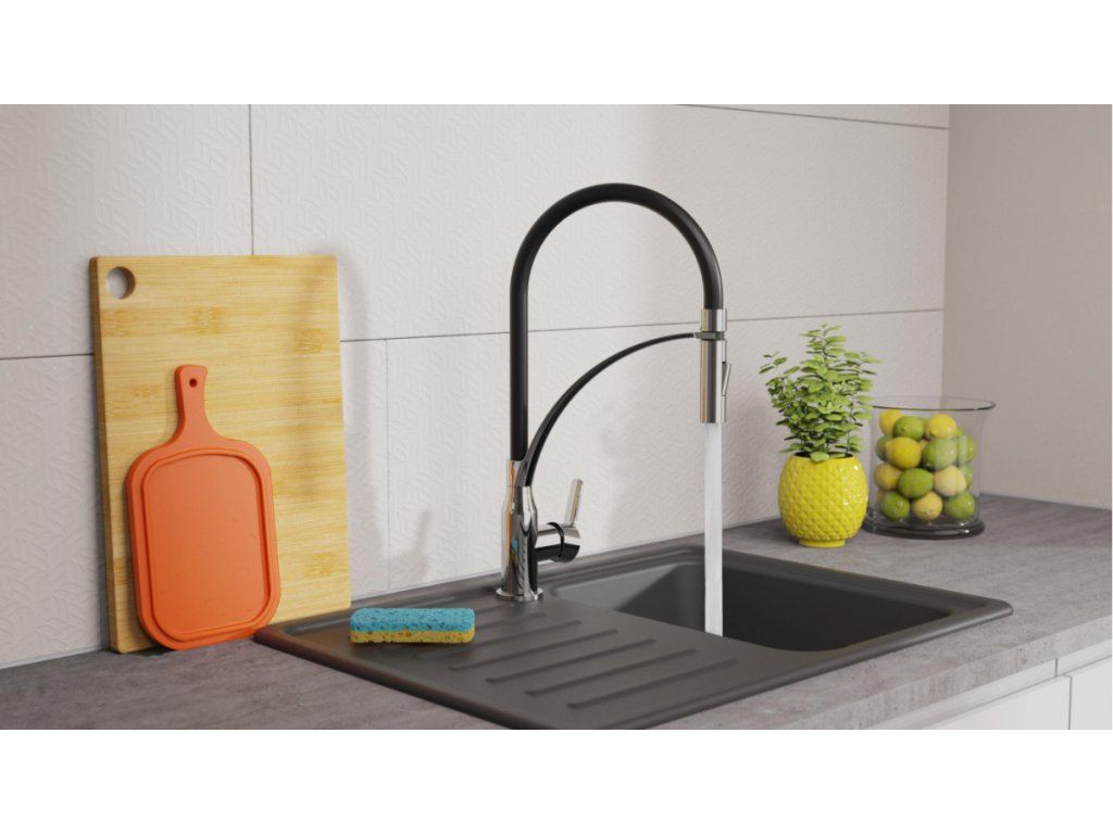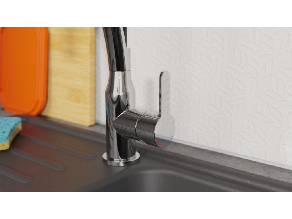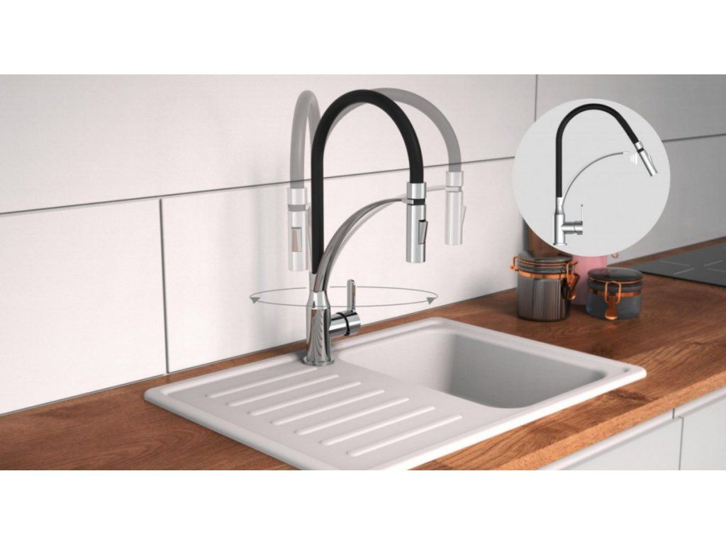 Díky kombinaci otočného výtoku a ohebné hlavici je baterie ideální volbou pro dvojité dřezy. Kuchyňská baterie disponuje funkcí studeného startu tj. ve středové poloze páky teče pouze studená voda.