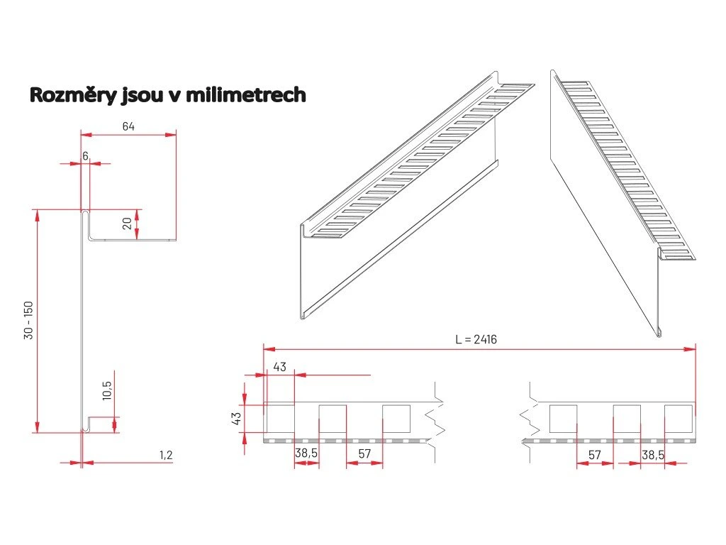 Hliníková obvodová lišta pro dokonalé pohledové zakončení obvodových stran terasy. Lišta je antracitové barvy a je vyrobena z hliníku. Ideální zakončení terasy pro dlažbu od minimální tloušťky 20 mm. Lišta má výřezy pro distanční křidélka podložek na dlažbu, tak aby lišta dokonale sedla přímo na hlavy podložek. Lišty se spojují pomocí průběžné hliníkové spojky a rohové hliníkové spojky odpovídající výšky. Výška lišty je 90 mm, délka 2416 mm.Doplňkové parametry