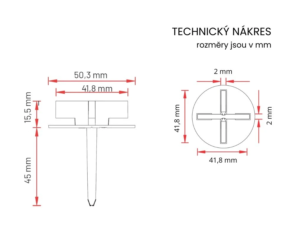 Spárovací křížek pod dlažbu pro písčité, štěrkové a travnaté povrchy. Nový spárovací křížek Vám umožní vytvořit super-rychlé, snadné a efektivní venkovní terasy s betonovou či keramickou dlažbou. Použití spárovacího křížku zajišťuje maximální stabilitu ploch s rovnoměrnými spárami. Stabilitu zajišťuje dlouhý trn na spodní straně spárovacího křížku. Díky vymezujícím destičkám o síle 2 mm je možné spárovací křížky použít v kombinaci s terči nebo výškově stavitelnými podložkami pod dlažbu. Průměr 50 mm, délka trnu 45 mm.Doplňkové parametry