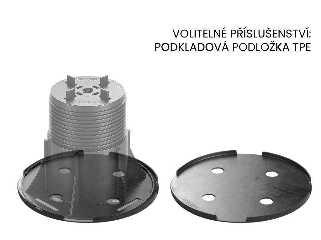 Výškově stavitelná podložka pod dlažbu NEW BASIC NB4 v rozmezí 90 - 160 mm Hlava podložky je spojena se závitem. Výšku podložek pro dlažbu NEW BASIC, lze nastavit před pokládkou dlažby pomocí vyrovnávacího klíče. Klíčové vlastnosti podložek NEW BASIC: | Výškově nastavitelná | Podložku pod dlažbu NB4 je možné plynule výškově nastavit v rozmezí 90 – 160 mm. Kompletní řada podložek NEW BASIC je výškově stavitelná v rozmezí 15mm až 700mm. | Rychlá, snadná a ekonomická instalace | Instalace terasy na stavitelné terče je rychlé a snadné a tím pádem ho zvládne každý sám s minimem nástrojů, díky tomu ušetří čas a peníze. Na vyžádání Vám zpracujeme zdarma profesionální kladečský plán terasy, pokud si budete přát terasu přijedeme zaměřit. | Vysoká nosnost | Nosnost každé jednotlivé podložky na dlažbu je až 1000 kg. Díky vysoké nosnosti jsou podložky NEW BASIC ideálním řešením pro velkoformátové venkovní dlažby keramické i betonové. Keramická dlažba ideálně odDoplňkové parametry