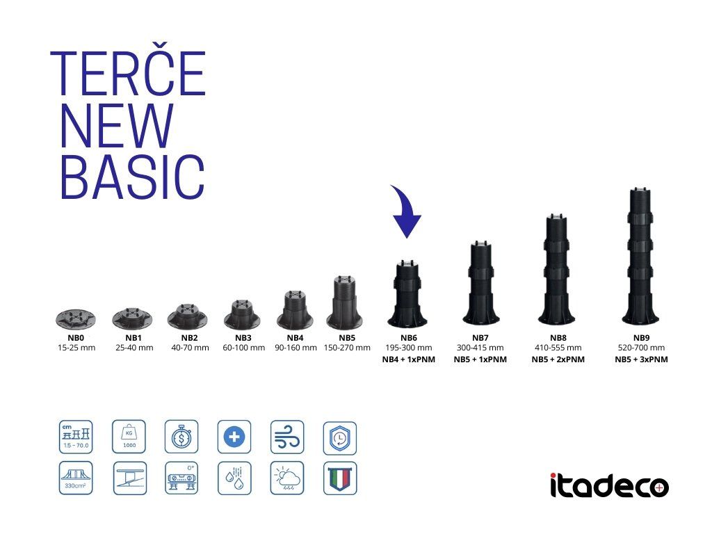 Výškově stavitelná podložka pod dlažbu NEW BASIC NB6 v rozmezí 195 - 300 mm Podložka NB6 je složena z podložky NB4 + 1x prodlužovacího nástavce PNM. Hlava podložky je spojena se závitem. Výšku podložek pro dlažbu NEW BASIC, lze nastavit před pokládkou dlažby pomocí vyrovnávacího klíče. Klíčové vlastnosti podložek NEW BASIC: | Výškově nastavitelná | Podložku pod dlažbu NB6 je možné plynule výškově nastavit v rozmezí 195 – 300 mm. Kompletní řada podložek NEW BASIC je výškově stavitelná v rozmezí 15mm až 700mm. | Rychlá, snadná a ekonomická instalace | Instalace terasy na stavitelné terče je rychlé a snadné a tím pádem ho zvládne každý sám s minimem nástrojů, díky tomu ušetří čas a peníze. Na vyžádání Vám zpracujeme zdarma profesionální kladečský plán terasy, pokud si budete přát terasu přijedeme zaměřit. | Vysoká nosnost | Nosnost každé jednotlivé podložky na dlažbu je až 1000 kg. Díky vysoké nosnosti jsou podložky NEW BASIC ideálním řešením proBuďte první, kdo napíše příspěvek k této položce.