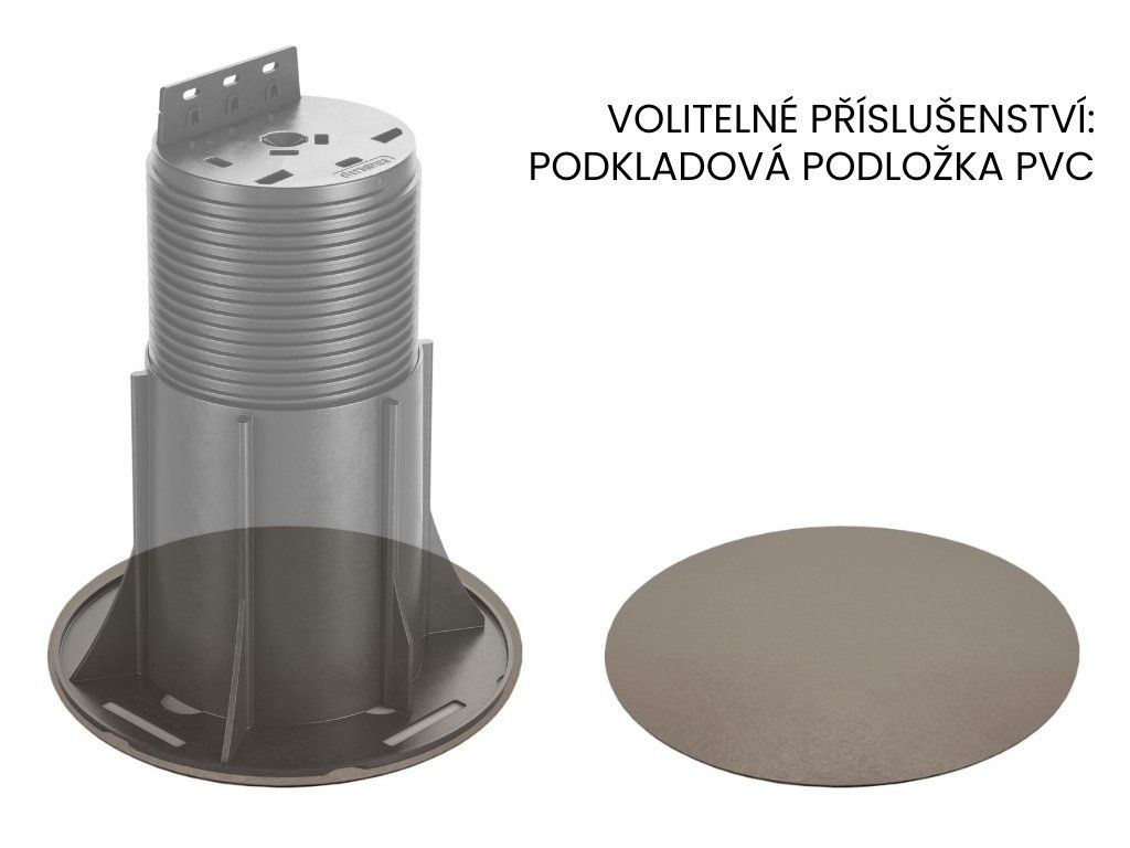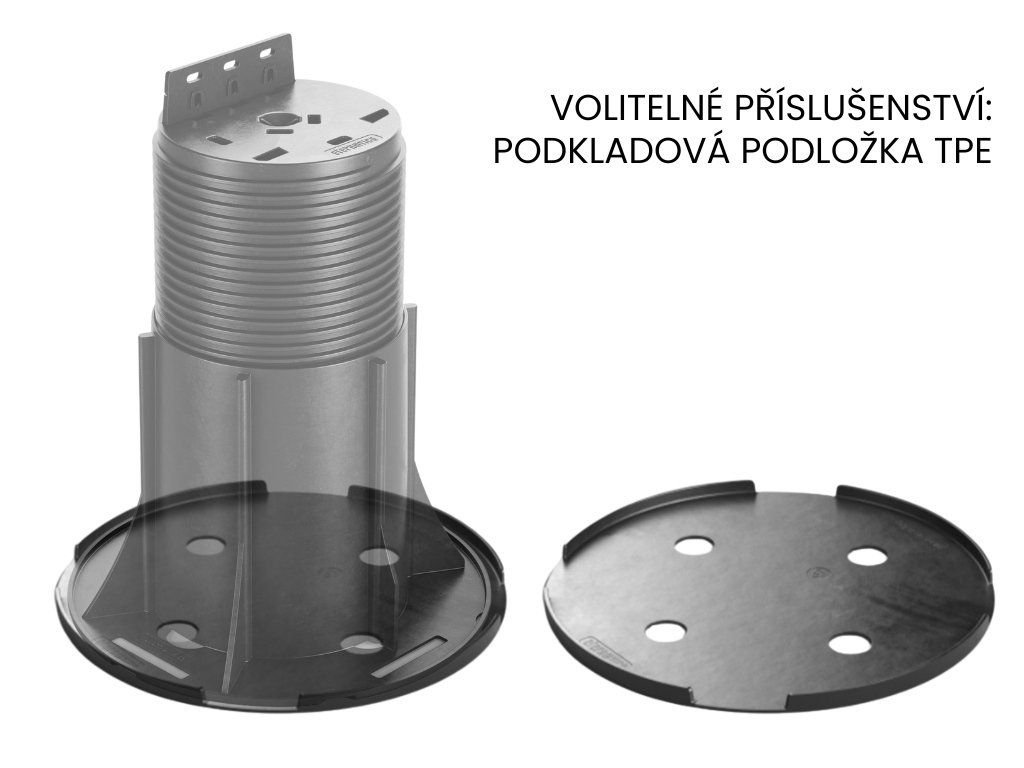 Rektifikační podložka pod terasová prkna a rošt NEW BASIC Wood NBW5, výškově nastavitelná v rozmezí 150 - 270 mm Hlava podložky je spojena se závitem a je opatřena opěrnou destičkou pro snadné připevnění všech typů terasových nosníků (hliník, dřevo nebo WPC - dřevoplast). Boční připevnění k terasovému nosníku vrutem, umožňuje regulaci výšky podložky i po spojení podložky s nosníkem nebo roštem. Klíčové vlastnosti podložek NEW BASIC Wood: | Výškově nastavitelná | Podložku pod terasová prkna a rošt NBW5 je možné plynule výškově nastavit v rozmezí 150 – 270 mm. Kompletní řada podložek New Basic Wood je výškově stavitelná v rozmezí 15mm až 700mm. | Rychlá, snadná a ekonomická instalace | Instalace terasy na stavitelné terče pod dřevěnou terasu je rychlé a snadné, díky tomu ušetříte čas a peníze. Dřevěnou terasu můžete postavit svépomocí s minimem nástrojů. Abychom Vám to ulehčili, na vyžádání Vám zpracujeme zdarma profesionální kladečský plán terasy, pokud si budeteDoplňkové parametry
