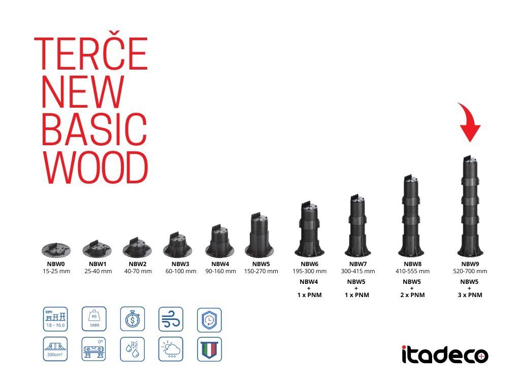 Rektifikační podložka pod terasová prkna a rošt NEW BASIC Wood NBW9, výškově nastavitelná v rozmezí 520 - 700 mm Podložka NBW9 je složena z podložky NBW5 + 3x prodlužovacího nástavce PNM. Hlava podložky je spojena se závitem a je opatřena opěrnou destičkou pro snadné připevnění všech typů terasových nosníků (hliník, dřevo nebo WPC - dřevoplast). Boční připevnění k terasovému nosníku vrutem, umožňuje regulaci výšky podložky i po spojení podložky s nosníkem nebo roštem. Klíčové vlastnosti podložek NEW BASIC Wood: | Výškově nastavitelná | Podložku pod terasová prkna a rošt NBW9 je možné plynule výškově nastavit v rozmezí 520 – 700 mm. Kompletní řada podložek New Basic Wood je výškově stavitelná v rozmezí 15mm až 700mm. | Rychlá, snadná a ekonomická instalace | Instalace terasy na stavitelné terče pod dřevěnou terasu je rychlé a snadné, díky tomu ušetříte čas a peníze. Dřevěnou terasu můžete postavit svépomocí s minimem nástrojů. Abychom Vám to ulehčili, naBuďte první, kdo napíše příspěvek k této položce.
