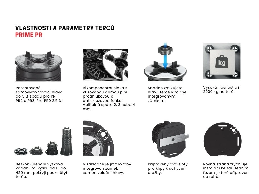 Terč pod dlažbu PRIME PR1 výškově nastavitelný v rozmezí 30 - 65 mm Terče PRIME je možné regulovat pomocí speciálního vyrovnávacího klíče, aniž by se muselo zasahovat do položeného povrchu. Klíčové vlastnosti terčů pod dlažbu PRIME: | Výškově nastavitelný | Terč pod dlažbu PR1 je možné plynule výškově nastavit v rozmezí 30 – 65 mm. Kompletní řada terčů PRIME je výškově stavitelná v rozmezí 15 mm až 420 mm. | Automatická regulace sklonu až do 5% | Unikátní patentovaná konstrukce výkyvné hlavy PR, zajišťuje automatickou regulaci sklonu až do 5% spádu podkladové vrstvy pro PR1, PR2 a PR3. Pro terč PRIME PR0 je samonivalace do 2,5 % spádu. Toto řešení zrychluje instalaci terasy a šetří Váš čas. | Rychlá, snadná a ekonomická instalace | Terče PRIME šetří váš čas potřebný na instalaci a pokládku, díky chytrému designu. Rovná strana základny zrychluje instalaci ke zdi. Základna je jedním řezem připravena do rohu terasy. Předřezaná křidélka odlomíte rukou,Doplňkové parametry