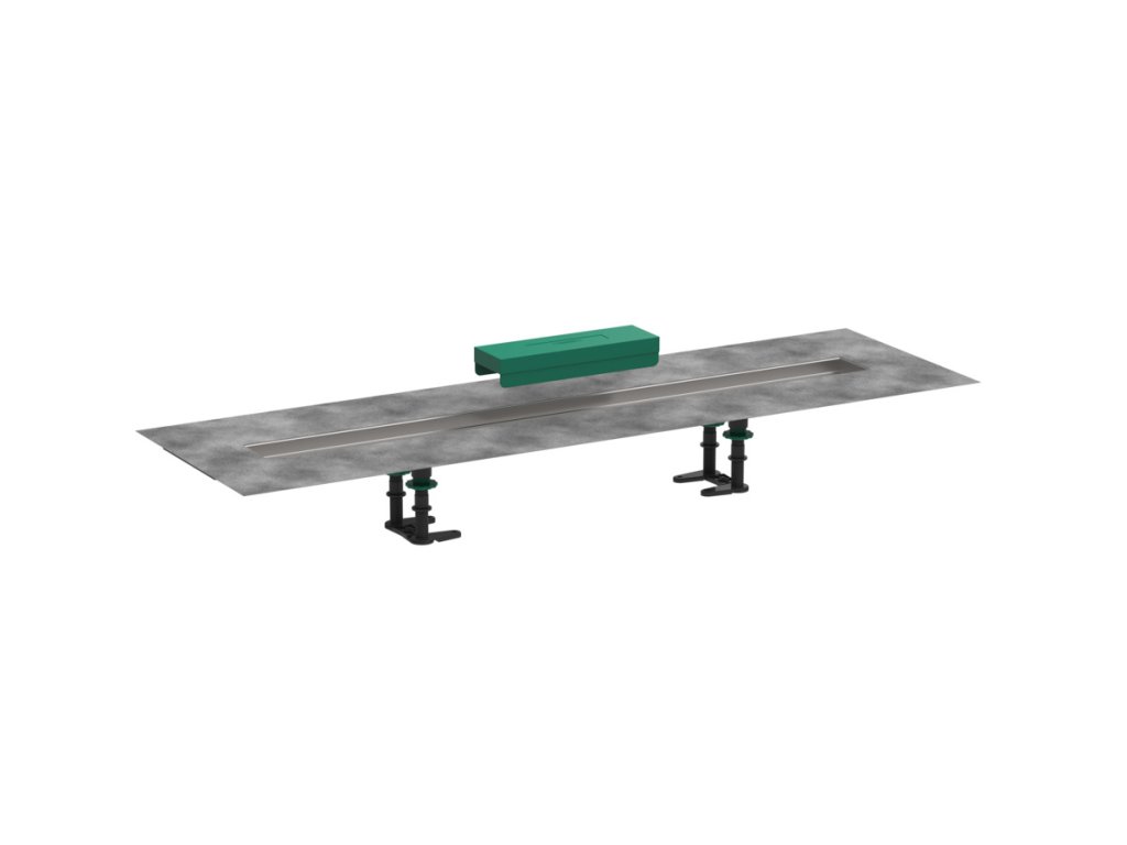Instalační sada hansgrohe RainDrain (90 cm) pro sprchové žlaby spojuje vrchní sadu hansgrohe RainDrain Rock nebo RainDrain Match s inovativním základním tělesem uBox universal. Obsahuje odtokový žlab z nerezové oceli se zabudovaným spádováním. Na tento vyspádovaný žlab se uchycuje vrchní sada sprchových žlabů hansgrohe RainDrain Rock a RainDrain Match. Součástí dodávky je také předem namontovaná těsnicí membrána pro jednoduchou instalaci a lepší ochranu před poškozením vodou. Promyšlená instalační sada představuje také praktické možnosti: nožky na spodní straně odtokového žlabu z nerezové oceli lze výškově nastavit, aby bylo možné během montáže zajistit dokonalé vyrovnání. Další praktické plus: Instalační sada obsahuje pomůcku pro zadláždění při instalaci s možností měření vzdálenosti – pomůže vám tak docílit dokonalého vzhledu sprchy.