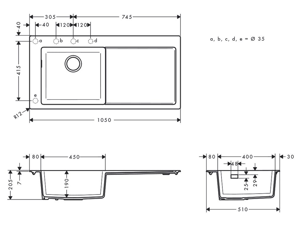 Vestavný dřez je namontován na pracovní desce o tloušťce 28–40 mm. Je vhodný pro spodní skříňku od 60 cm. Dřez má na zadní straně několik předdefinovaných otvorů pro individuální umístění kuchyňské baterie. Ty lze před instalací čistě a bez hran vyvrtat pomocí diamantového vrtáku, který je součástí dodávky. Dopilování není nutné. Odtoková souprava pro umyvadla je k dispozici samostatně ve třech verzích: manuální (#43927000), automatická (#43937000) nebo pro baterie hansgrohe Select (#43947000).