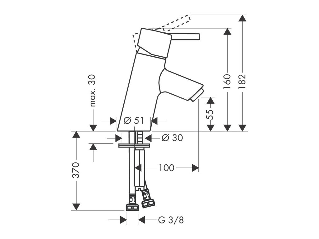 Tato varianta pákové baterie nemá páku k ovládání odpadu v umyvadle. Díky tomu působí design ještě úsporněji. Jako uzávěr umyvadla se doporučuje odtoková souprava push-open od hansgrohe (k dostání samostatně; č. 50100000).