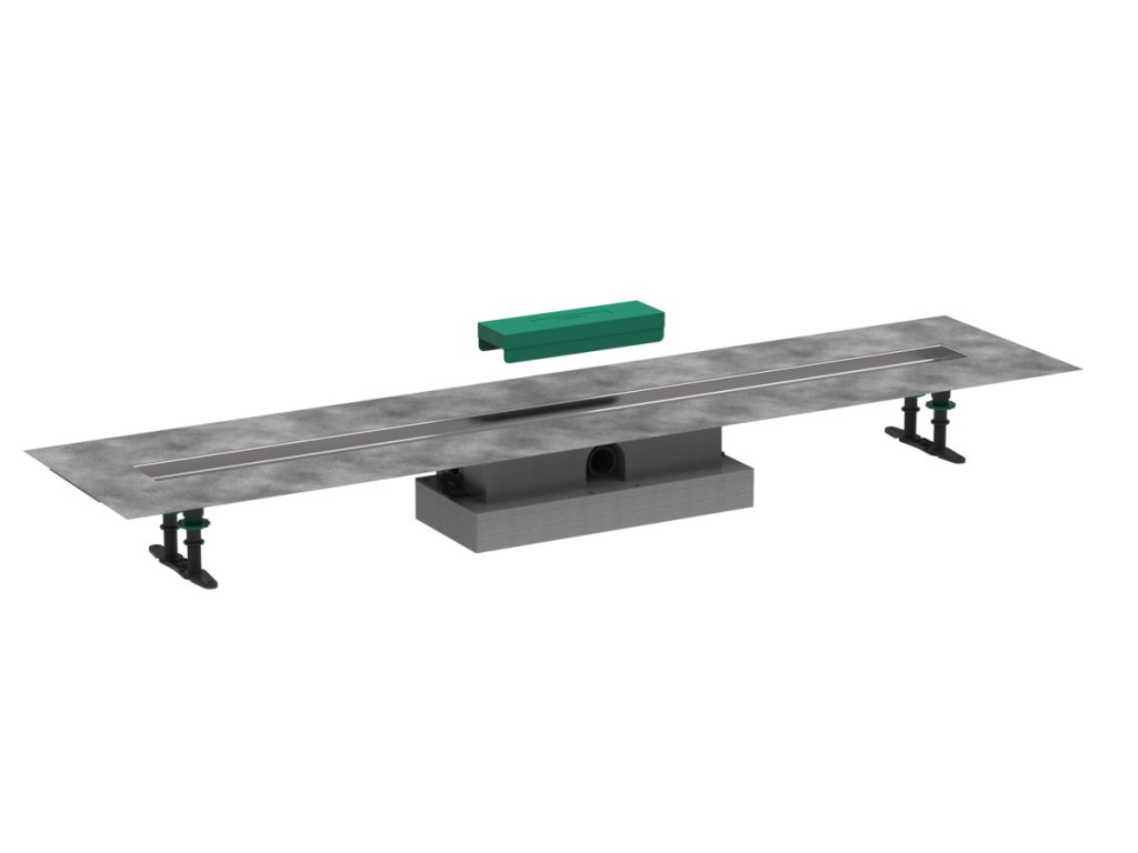 Úplná sada hansgrohe uBox universal (120 cm) pro plochou instalaci sprchových žlabů je váš praktický montážní systém pro vrchní sady sprchových žlabů hansgrohe RainDrain Rock a RainDrain Match 120 cm. Úplná sada pro plochou instalaci s výškou vodní uzávěry 30 mm obsahuje základní těleso, montážní sadu se zabudovaným spádováním, na kterou je namontován sprchový kanálek, a rovněž předem namontovanou těsnicí membránu a standardní sifon.