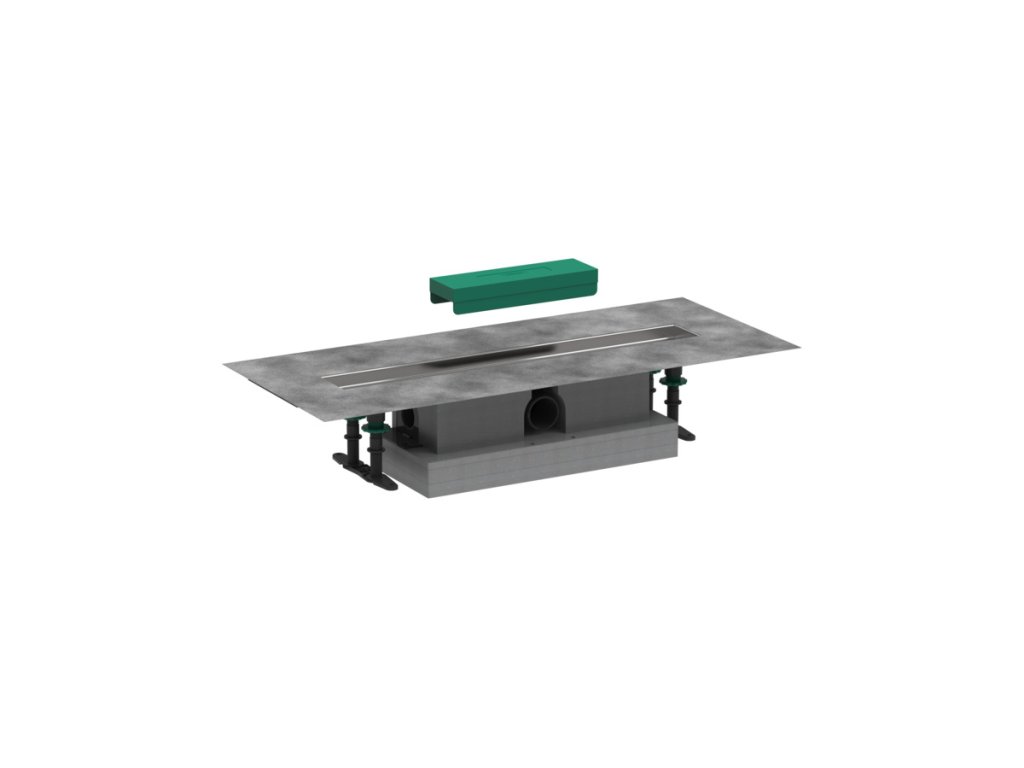 Úplná sada hansgrohe uBox universal (60 cm) pro standardní instalaci sprchových žlabů je váš praktický montážní systém pro vrchní sady sprchových žlabů hansgrohe RainDrain Rock a RainDrain Match 60 cm. Úplná sada obsahuje základní těleso, odpovídající montážní sadu se zabudovaným spádováním, na kterou je namontován sprchový žlab, a rovněž předem namontovanou těsnicí membránu a standardní sifon.