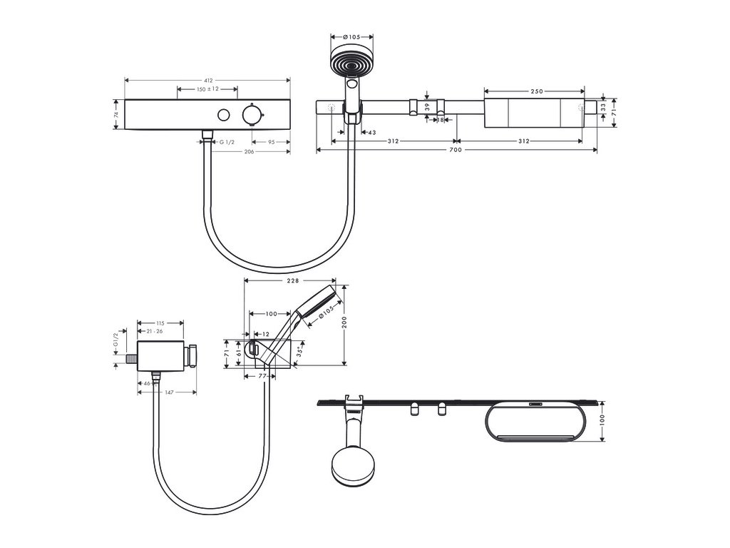 Hansgrohe WallStoris MATNÁ ČERNÁ Sada: ruční sprcha 105 3jet Activation EcoSmart, termostat, nástěnná tyč 70 cm a sada pro odkládání