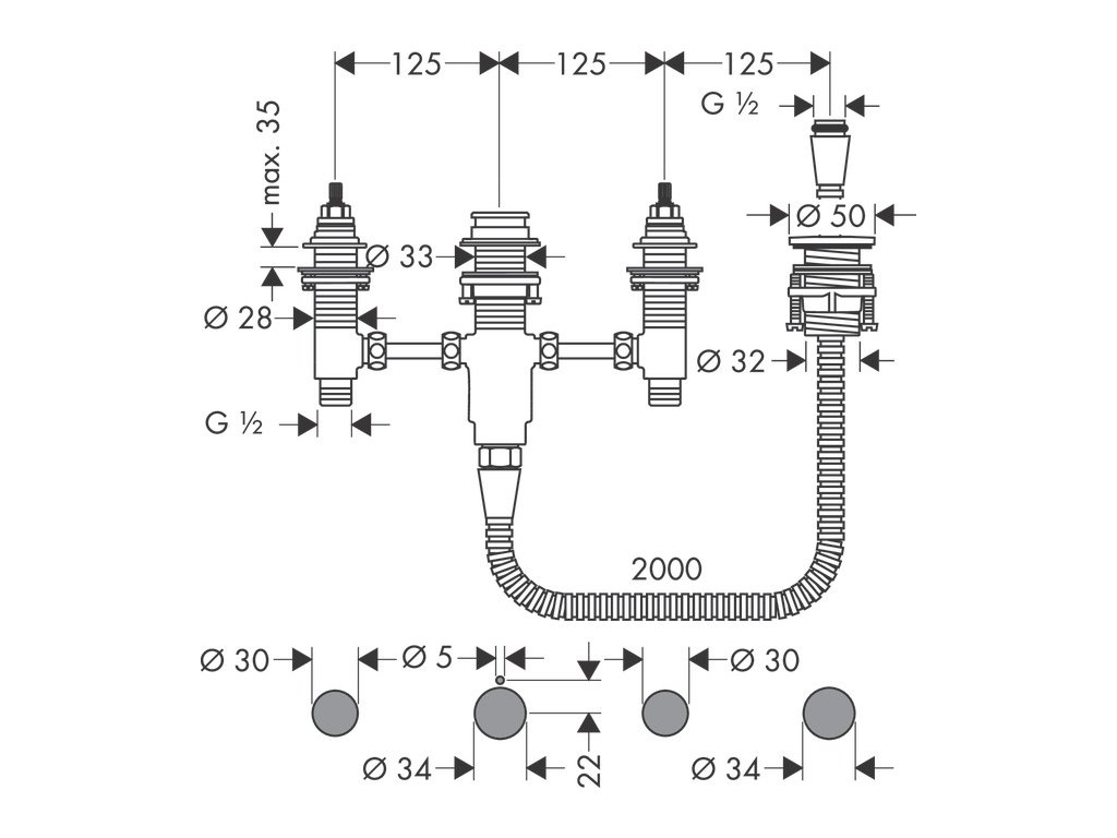Hansgrohe základní těleso pro čtyřotvorovou baterii na okraj vany 13244180• obsahuje: základní těleso sprchový držák sprchová hadice