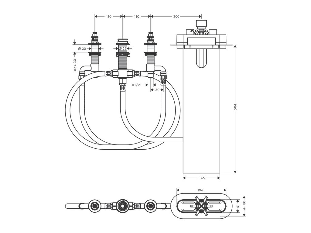 Základní těleso pro čtyřotvorovou baterii s montáží na okraj vany od hansgrohe se používá k bezpečné montáži odpovídající baterie s ruční sprchou – například řady Vivenis. Okraj vany musí být široký nejméně 100 mm. Pokrývá rozsah 0–30 mm. Kromě základního tělesa baterie je součástí balení také připojení boxu na hadici (hansgrohe sBox). Přidržuje vytahovací sprchovou hadici ruční sprchy.