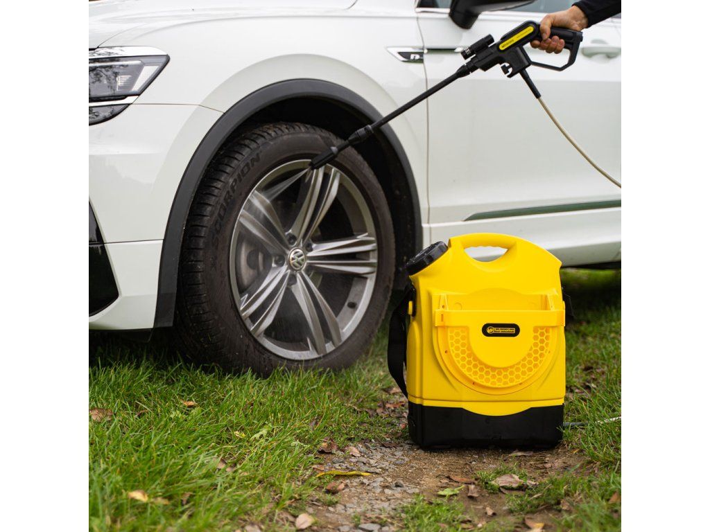 Přenosná tlaková myčka Helpmation jemně a precizně umyje kola na závodech nebo na dovolené, automobil, karavan, loď nebo zahradní nábytek a nářadí. Na jednu nádrž umyjete až 3 kola a dvě nádrže stačí na opravdu důkladné umytí osobního automobilu.