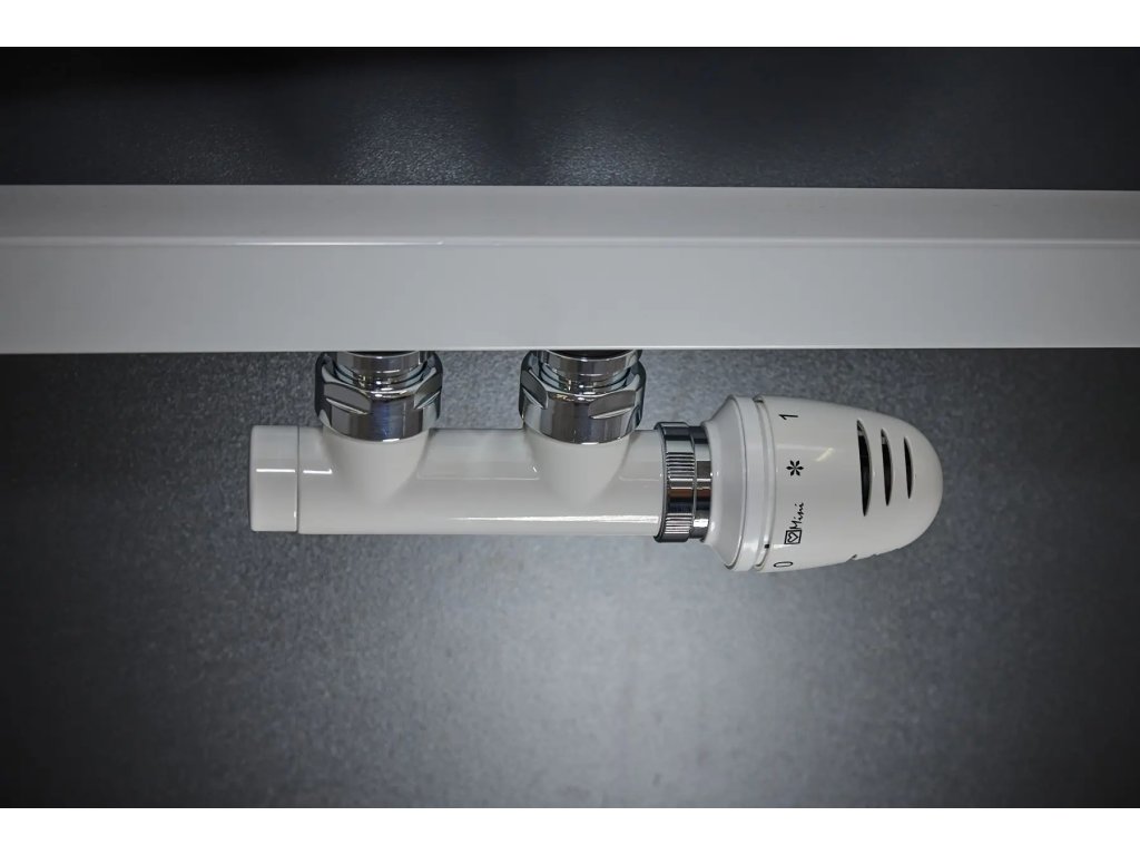 Rohové H šroubení s integrovaným termostatickým ventilem - bílý (S 3691 44) + termostatická hlavice MINI GS design - bílá (S 9200 34) + 2ks svěrné šroubení chrom pro Cu trubku 15 x 1 mm (S 6286 15)