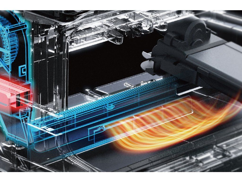 Teplý vzduch proudí speciálním větrným tunelem rovnoměrně z LEGEE LuLu na celou plochu mopu, který je tak rovnoměrně, rychle a úsporně vysušen.
