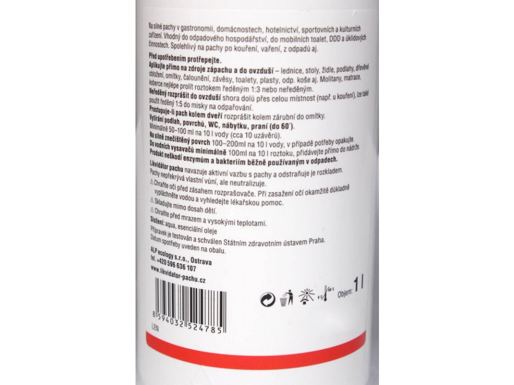 Jedná se o zcela přírodní - zdravotně nezávadný přípravek, který zápach nejen neutralizuje, ale díky přírodním esenciálním olejům příjemně provoní okolní vzduch.