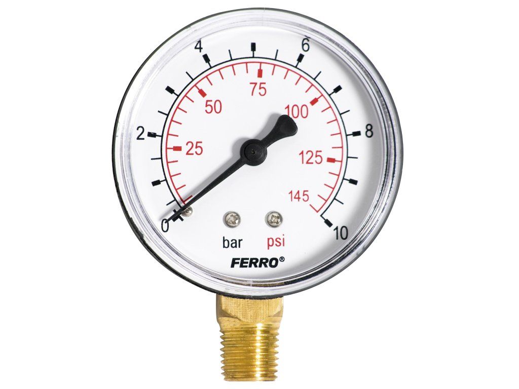Manometr radiální<br />• Tělo hliníkové - práškově lakováno<br />• Kryt: ABS s vysokou pevností, odolný proti poškrábání<br />• třída přesnosti: 2,5<br />• průměr těla: 63 mm<br />• rozsah tlaku:0-10 bar<br />• připojení: 1/4” boční<br />Doplňkové parametry