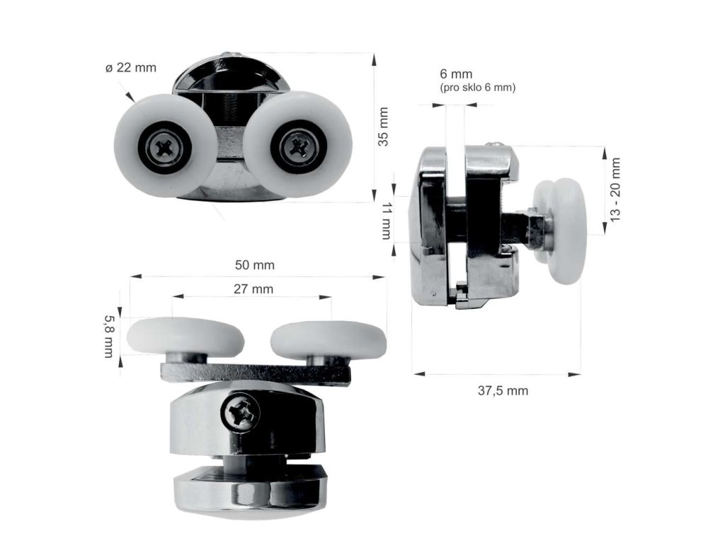 Sady pojezdů - horní, pojezdy pevné, pro kouty a dveře LIMA CK608..K, CK804xxK, sada 4 ksDoplňkové parametry