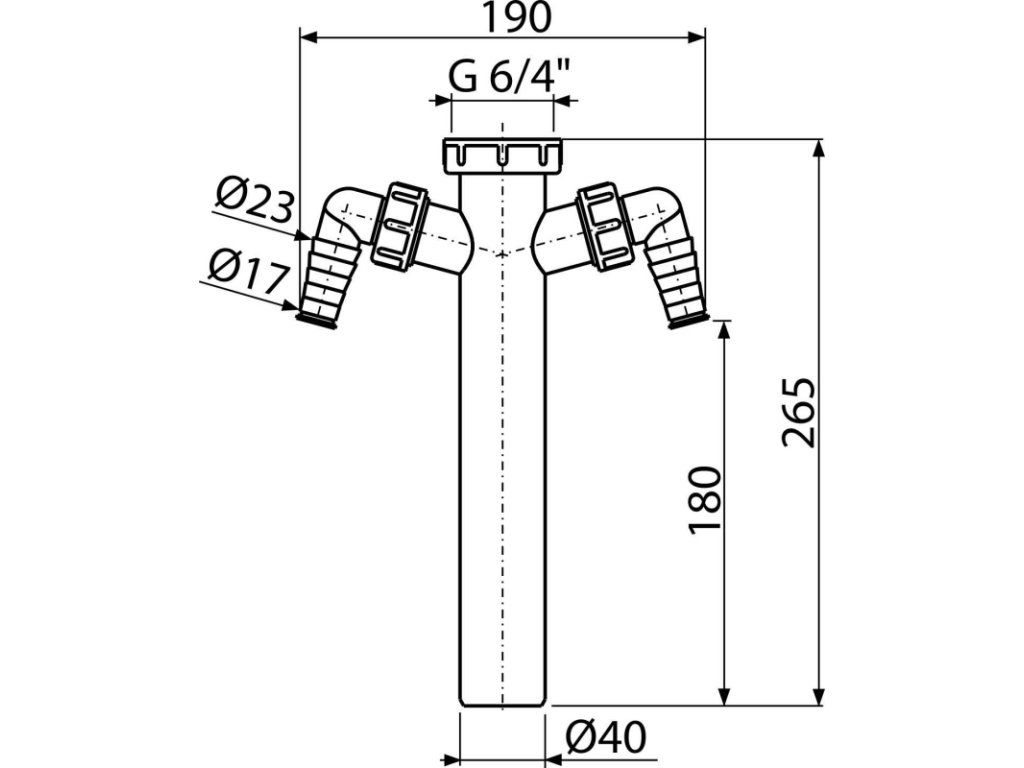 Mezikus k sifonu DN 40 s převlečnou maticí G 6/4" a dvěma přípojkami Ø 17–23 mm, délka 265, plast A44M-DN40