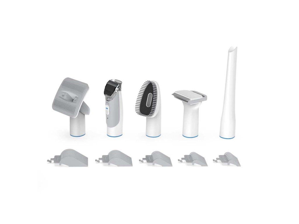 Sada s vysavačem obsahuje pět různých nástavců. Kartáč na péči o srst, trimovací hřeben DeShedding, elektrický střihací strojek, štěrbinovou a kartáčovou hubici pro snadný úklid.