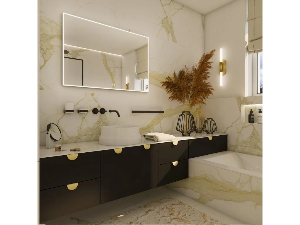 Obdélníkové zrcadlo s rámem s ostrými rohy a celoobvodovým svícením pro dokonalé a rovnoměrné osvětlení. Zrcadlo se ovládá dvěma dotykovými podsvícenými senzory, které umožňují změnu barvy světla, nastavení intenzity osvětlení (stmívání) a disponují paměťovou funkcí pro uložení posledního nastavení. Kromě toho lze zrcadlo ovládat i pomocí nástěnného vypínače, což zvyšuje jeho flexibilitu a pohodlí použití. Pro dosažení kvalitního a rovnoměrného svícení je použit akrylový difuzor, který zajišťuje měkký a harmonický rozptyl světla bez viditelných bodových zdrojů. LED diody jsou vkusně integrovány do rámu spolu s difuzorem, což přispívá k elegantnímu a čistému vzhledu zrcadla. Zrcadlo využívá nejmodernější LED čipy SMD 2835, které jsou známé svou vysokou svítivostí, energetickou úsporností a dlouhou životností. Hustota čipů 96+96/m (192/m), životnost 50 000 hodin. Parametry LED: Survival Factor = 1, Lumen Maintenance Factor 0,99 a Flicker Metric 0,02, pak zajišťují stabilní, bezblikavé a dlouhodobě konzistentní osvětlení. Nosná konstrukce zrcadla je vyrobena z masivního hliníkového rámu o rozměrech 32x19 mm, který zajišťuje vysokou pevnost a stabilitu. Stejně tak je z hliníku vyroben kryt zdroje a všech elektronických součástek. Sklo o tloušťce 5 mm je opatřeno bezpečnostní fólií, která chrání před zraněním v případě rozbití. Zrcadlo navíc disponuje stupněm ochrany proti vlhkosti IP44, což zaručuje spolehlivost i v prostředí s vyšší vlhkostí. Zrcadlo splňuje všechny české normy a je opatřeno českým certifikátem CE, který zaručuje jeho kvalitu a bezpečnost. Nabízí flexibilní možnosti upevnění, a to jak vertikálně, tak horizontálně, a je dodáváno včetně kompletní montážní sady a kabelové spojky s ochranou IP44. Pro zajištění bezpečné přepravy je zrcadlo pečlivě zabaleno a připraveno k expedici prostřednictvím kurýrní služby. Ovládání: Dotykové senzory + možnost ovládání nástěnným vypínačem Nastavení barvy světla: Ano Barva světla: Nastavitelná v rozsahu 3000–6500 K (od teplé po studenou bílou) Funkce stmívání: Plynulé stmívání Paměť nastavení: Automatická paměť nastavení Konstrukce svícení: K rovnoměrnému rozptylu světla zrcadlo disponuje akrylovým matovaným difuzorem Integrace LED: Led diody jsou zabudované v rámu LED čip: Nejmodernější LED čipy SMD 2835 LED pásek - hustota čipů: 192/m (96+96/m) Životnost LED čipů: Až 50 000 hodin Kvalita osvětlení LED: Survival Factor = 1; Lumen maintenance factor = 0,99; Flicker metric = 0,02 Materiál: Zrcadlové sklo, hliník Materiál konstrukce: Rám zrcadla a kryt zdroje jsou vyrobeny z hliníku Tloušťka skla: 5 mm Ochrana při rozbití: Bezpečnostní fólie Stupeň ochrany: IP 44 Certifikace: Český certifikát CE Umístění: Montáž na stěnu Možnost upevnění vertikálně i horizontálně Montážní příslušenství: Součástí balení je montážní sada a kabelová spojka s ochranou IP 44 Obal: Zabalené pro přepravu kurýrní službou Napětí: Vstupní napětí 220-240 V Výstupní napětí 12 V Příkon: 49 W, světelný tok: 3528 lm Rozměr: v: 700 mm š: 37 mm d: 1000 mm Hmotnost: 11,8 kgDoplňkové parametry