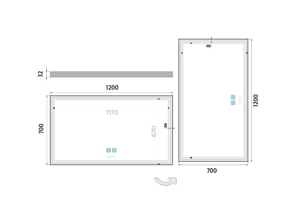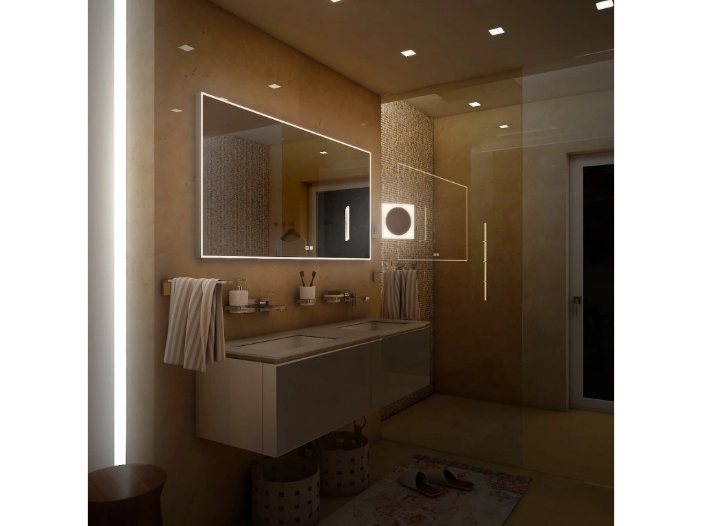 Obdélníkové zrcadlo s rámem s ostrými rohy a celoobvodovým svícením pro dokonalé a rovnoměrné osvětlení. Zrcadlo se ovládá dvěma dotykovými podsvícenými senzory, které umožňují změnu barvy světla, nastavení intenzity osvětlení (stmívání) a disponují paměťovou funkcí pro uložení posledního nastavení. Kromě toho lze zrcadlo ovládat i pomocí nástěnného vypínače, což zvyšuje jeho flexibilitu a pohodlí použití. Pro dosažení kvalitního a rovnoměrného svícení je použit akrylový difuzor, který zajišťuje měkký a harmonický rozptyl světla bez viditelných bodových zdrojů. LED diody jsou vkusně integrovány do rámu spolu s difuzorem, což přispívá k elegantnímu a čistému vzhledu zrcadla. Zrcadlo využívá nejmodernější LED čipy SMD 2835, které jsou známé svou vysokou svítivostí, energetickou úsporností a dlouhou životností. Hustota čipů 96+96/m (192/m), životnost 50 000 hodin. Parametry LED: Survival Factor = 1, Lumen Maintenance Factor 0,99 a Flicker Metric 0,02, pak zajišťují stabilní, bezblikavé a dlouhodobě konzistentní osvětlení. Nosná konstrukce zrcadla je vyrobena z masivního hliníkového rámu o rozměrech 32x19 mm, který zajišťuje vysokou pevnost a stabilitu. Stejně tak je z hliníku vyroben kryt zdroje a všech elektronických součástek. Sklo o tloušťce 5 mm je opatřeno bezpečnostní fólií, která chrání před zraněním v případě rozbití. Zrcadlo navíc disponuje stupněm ochrany proti vlhkosti IP44, což zaručuje spolehlivost i v prostředí s vyšší vlhkostí. Zrcadlo splňuje všechny české normy a je opatřeno českým certifikátem CE, který zaručuje jeho kvalitu a bezpečnost. Nabízí flexibilní možnosti upevnění, a to jak vertikálně, tak horizontálně, a je dodáváno včetně kompletní montážní sady a kabelové spojky s ochranou IP44. Pro zajištění bezpečné přepravy je zrcadlo pečlivě zabaleno a připraveno k expedici prostřednictvím kurýrní služby. Ovládání: Dotykové senzory + možnost ovládání nástěnným vypínačem Nastavení barvy světla: Ano Barva světla: Nastavitelná v rozsahu 3000–6500 K (od teplé po studenou bílou) Funkce stmívání: Plynulé stmívání Paměť nastavení: Automatická paměť nastavení Konstrukce svícení: K rovnoměrnému rozptylu světla zrcadlo disponuje akrylovým matovaným difuzorem Integrace LED: Led diody jsou zabudované v rámu LED čip: Nejmodernější LED čipy SMD 2835 LED pásek - hustota čipů: 192/m (96+96/m) Životnost LED čipů: Až 50 000 hodin Kvalita osvětlení LED: Survival Factor = 1; Lumen maintenance factor = 0,99; Flicker metric = 0,02 Materiál: Zrcadlové sklo, hliník Materiál konstrukce: Rám zrcadla a kryt zdroje jsou vyrobeny z hliníku Tloušťka skla: 5 mm Ochrana při rozbití: Bezpečnostní fólie Stupeň ochrany: IP 44 Certifikace: Český certifikát CE Umístění: Montáž na stěnu Možnost upevnění vertikálně i horizontálně Montážní příslušenství: Součástí balení je montážní sada a kabelová spojka s ochranou IP 44 Obal: Zabalené pro přepravu kurýrní službou Napětí: Vstupní napětí 220-240 V Výstupní napětí 12 V Příkon: 55 W, světelný tok: 3960 lm Rozměr: v: 700 mm š: 37 mm d: 1200 mm Hmotnost: 13,86 kgDoplňkové parametry