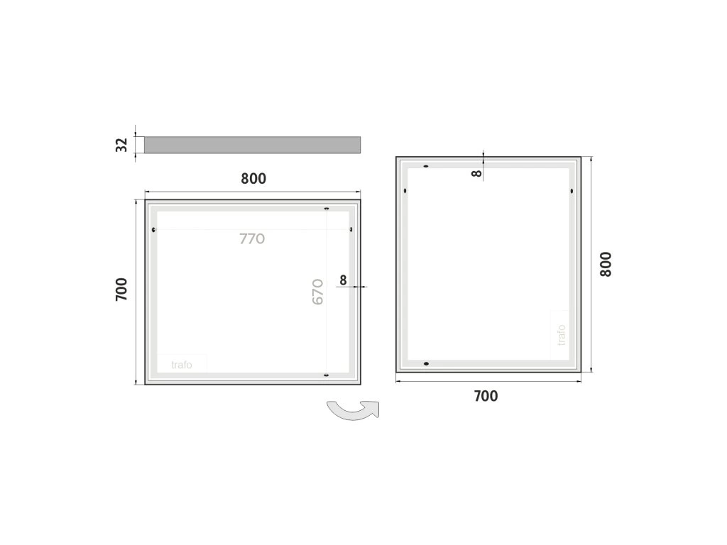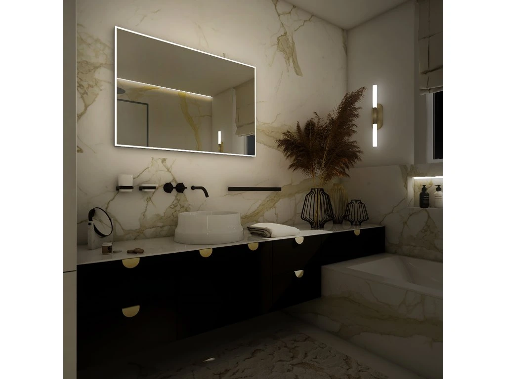 Obdélníkové zrcadlo s rámem s ostrými rohy a celoobvodovým svícením pro dokonalé a rovnoměrné osvětlení. Zrcadlo bez integrovaného vypínače je určené k připojení a ovládání nástěnným vypínačem. Barva světla zrcadla je pevně nastavena. Pro dosažení kvalitního a rovnoměrného svícení je použit akrylový difuzor, který zajišťuje měkký a harmonický rozptyl světla bez viditelných bodových zdrojů. LED diody jsou vkusně integrovány do rámu spolu s difuzorem, což přispívá k elegantnímu a čistému vzhledu zrcadla. Zrcadlo využívá nejmodernější LED čipy SMD 2835, které jsou známé svou vysokou svítivostí, energetickou úsporností a dlouhou životností. Hustota čipů 96/m, životnost 50 000 hodin. Parametry LED: Survival Factor = 1, Lumen Maintenance Factor 0,99 a Flicker Metric 0,02, pak zajišťují stabilní, bezblikavé a dlouhodobě konzistentní osvětlení. Nosná konstrukce zrcadla je vyrobena z masivního hliníkového rámu o rozměrech 32x19 mm, který zajišťuje vysokou pevnost a stabilitu. Stejně tak je z hliníku vyroben kryt zdroje a všech elektronických součástek. Sklo o tloušťce 5 mm je opatřeno bezpečnostní fólií, která chrání před zraněním v případě rozbití. Zrcadlo navíc disponuje stupněm ochrany proti vlhkosti IP44, což zaručuje spolehlivost i v prostředí s vyšší vlhkostí. Zrcadlo splňuje všechny české normy a je opatřeno českým certifikátem CE, který zaručuje jeho kvalitu a bezpečnost. Nabízí flexibilní možnosti upevnění, a to jak vertikálně, tak horizontálně, a je dodáváno včetně kompletní montážní sady a kabelové spojky s ochranou IP44. Pro zajištění bezpečné přepravy je zrcadlo pečlivě zabaleno a připraveno k expedici prostřednictvím kurýrní služby. Ovládání: Bez integrovaného spínače Ovládání nástěnným vypínačem Nastavení barvy světla: Barva světla pevně nastavena Barva světla: 4000 K (neutrální bílé světlo, ideální pro přesné a přirozené osvětlení) Funkce stmívání: Není instalováno Paměť nastavení: Není instalováno Konstrukce svícení: K rovnoměrnému rozptylu světla zrcadlo disponuje akrylovým matovaným difuzorem Integrace LED: Led diody jsou zabudované v rámu LED čip: Nejmodernější LED čipy SMD 2835 LED pásek - hustota čipů: 96/m Životnost LED čipů: Až 50 000 hodin Kvalita osvětlení LED: Survival Factor = 1; Lumen maintenance factor = 0,99; Flicker metric = 0,02 Materiál: Zrcadlové sklo, hliník Materiál konstrukce: Rám zrcadla a kryt zdroje jsou vyrobeny z hliníku Tloušťka skla: 5 mm Ochrana při rozbití: Bezpečnostní fólie Stupeň ochrany: IP 44 Certifikace: Český certifikát CE Umístění: Montáž na stěnu Možnost upevnění vertikálně i horizontálně Montážní příslušenství: Součástí balení je montážní sada a kabelová spojka s ochranou IP 44 Obal: Zabalené pro přepravu kurýrní službou Napětí: Vstupní napětí 220-240 V Výstupní napětí 12 V Příkon: 44 W, světelný tok: 3168 lm Rozměr: v: 700 mm š: 35 mm d: 800 mm Hmotnost: 9,5 kgDoplňkové parametry