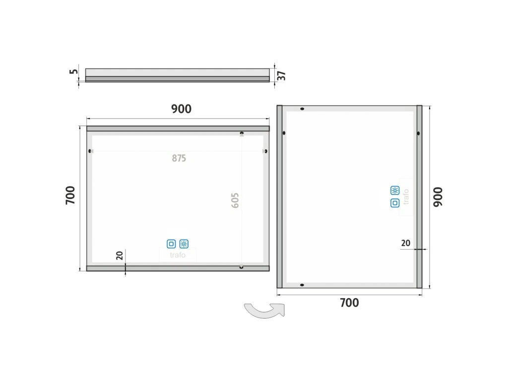 Obdélníkové bezrámové zrcadlo s ostrými rohy a podsvícením ze spodu a shora pro rovnoměrné a stylové osvětlení. Zrcadlo se ovládá dvěma dotykovými podsvícenými senzory, které umožňují změnu barvy podsvícení, nastavení intenzity osvětlení (stmívání) a disponují paměťovou funkcí pro uložení posledního nastavení. Kromě toho lze zrcadlo ovládat i pomocí nástěnného vypínače, což zvyšuje jeho flexibilitu a pohodlí použití. Ke zlepšení kvality podsvícení je použit difuzor z akrylového skla, který zajišťuje rovnoměrný a měkký rozptyl světla. LED diody jsou elegantně integrovány přímo v difuzoru, což zvyšuje intenzitu světla a zaručuje jeho jednotné rozprostření po celé ploše podsvícení. Výsledkem je příjemné a rovnoměrné osvětlení bez viditelných bodových zdrojů. Zrcadlo využívá nejmodernější LED čipy SMD 2835, které jsou známé svou vysokou svítivostí, energetickou úsporností a dlouhou životností. Hustota čipů 96+96/m (192/m), životnost 50 000 hodin. Parametry LED: Survival Factor = 1, Lumen Maintenance Factor 0,99 a Flicker Metric 0,02, pak zajišťují stabilní, bezblikavé a dlouhodobě konzistentní osvětlení. Nosná konstrukce zrcadla je vyrobena z masivního hliníkového rámu o rozměrech 32x19 mm, který zajišťuje vysokou pevnost a stabilitu. Stejně tak je z hliníku vyroben kryt zdroje a všech elektronických součástek. Sklo o tloušťce 5 mm je opatřeno bezpečnostní fólií, která chrání před zraněním v případě rozbití. Zrcadlo navíc disponuje stupněm ochrany proti vlhkosti IP44, což zaručuje spolehlivost i v prostředí s vyšší vlhkostí. Zrcadlo splňuje všechny české normy a je opatřeno českým certifikátem CE, který zaručuje jeho kvalitu a bezpečnost. Nabízí flexibilní možnosti upevnění, a to jak vertikálně, tak horizontálně, a je dodáváno včetně kompletní montážní sady a kabelové spojky s ochranou IP44. Pro zajištění bezpečné přepravy je zrcadlo pečlivě zabaleno a připraveno k expedici prostřednictvím kurýrní služby. Ovládání: Dotykové senzory + možnost ovládání nástěnným vypínačem Nastavení barvy podsvícení: Ano Barva podsvícení: Nastavitelná v rozsahu 3000–6500 K (od teplé po studenou bílou) Funkce stmívání: Plynulé stmívání Paměť nastavení: Ano Konstrukce podsvícení: K rovnoměrnému rozptylu světla zrcadlo disponuje difuzorem z akrylového skla Integrace LED: LED diody jsou integrovány přímo v difuzoru LED čip: Nejmodernější LED čipy SMD 2835 LED pásek - hustota čipů: 192/m (96+96/m) Životnost LED čipů: Až 50 000 hodin Kvalita osvětlení LED: Survival Factor = 1; Lumen maintenance factor = 0,99; Flicker metric = 0,02 Materiál: Zrcadlové sklo, hliník Materiál konstrukce: Rám zrcadla a kryt zdroje jsou vyrobeny z hliníku Tloušťka skla: 5 mm Ochrana při rozbití: Bezpečnostní fólie Stupeň ochrany: IP 44 Certifikace: Český certifikát CE Umístění: Montáž na stěnu Možnost upevnění vertikálně i horizontálně Montážní příslušenství: Součástí balení je montážní sada a kabelová spojka s ochranou IP 44 Obal: Zabalené pro přepravu kurýrní službou Napětí: Vstupní napětí 220-240 V Výstupní napětí 12 V Příkon: 26 W, světelný tok: 1872 lm Rozměr: v: 700 mm š: 37 mm d: 900 mm Hmotnost: 11,4 kgDoplňkové parametry