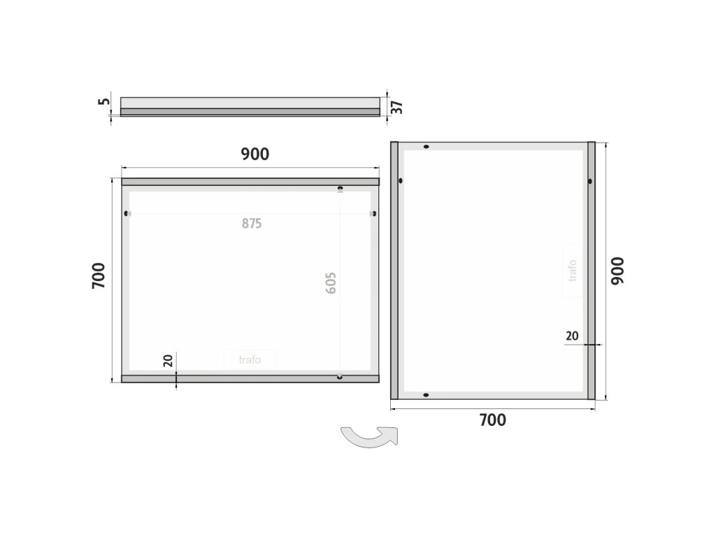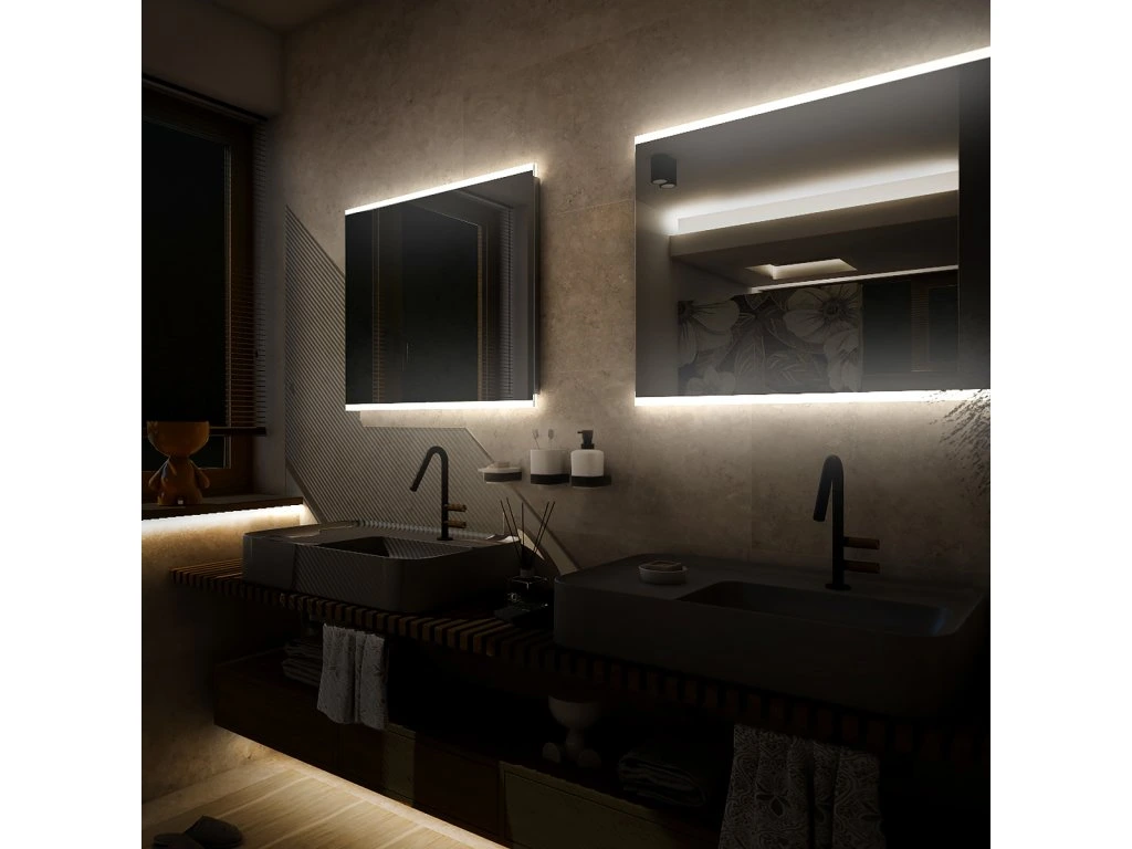Obdélníkové bezrámové zrcadlo s ostrými rohy a podsvícením ze spodu a shora pro rovnoměrné a stylové osvětlení. Zrcadlo bez integrovaného vypínače je určené k připojení a ovládání nástěnným vypínačem. Barva podsvícení zrcadla je pevně nastavena. Ke zlepšení kvality podsvícení je použit difuzor z akrylového skla, který zajišťuje rovnoměrný a měkký rozptyl světla. LED diody jsou elegantně integrovány přímo v difuzoru, což zvyšuje intenzitu světla a zaručuje jeho jednotné rozprostření po celé ploše podsvícení. Výsledkem je příjemné a rovnoměrné osvětlení bez viditelných bodových zdrojů. Zrcadlo využívá nejmodernější LED čipy SMD 2835, které jsou známé svou vysokou svítivostí, energetickou úsporností a dlouhou životností. Hustota čipů 96/m, životnost 50 000 hodin. Parametry LED: Survival Factor = 1, Lumen Maintenance Factor 0,99 a Flicker Metric 0,02, pak zajišťují stabilní, bezblikavé a dlouhodobě konzistentní osvětlení. Nosná konstrukce zrcadla je vyrobena z masivního hliníkového rámu o rozměrech 32x19 mm, který zajišťuje vysokou pevnost a stabilitu. Stejně tak je z hliníku vyroben kryt zdroje a všech elektronických součástek. Sklo o tloušťce 5 mm je opatřeno bezpečnostní fólií, která chrání před zraněním v případě rozbití. Zrcadlo navíc disponuje stupněm ochrany proti vlhkosti IP44, což zaručuje spolehlivost i v prostředí s vyšší vlhkostí. Zrcadlo splňuje všechny české normy a je opatřeno českým certifikátem CE, který zaručuje jeho kvalitu a bezpečnost. Nabízí flexibilní možnosti upevnění, a to jak vertikálně, tak horizontálně, a je dodáváno včetně kompletní montážní sady a kabelové spojky s ochranou IP44. Pro zajištění bezpečné přepravy je zrcadlo pečlivě zabaleno a připraveno k expedici prostřednictvím kurýrní služby. Ovládání: Bez integrovaného spínače Ovládání nástěnným vypínačem Nastavení barvy podsvícení: Barva podsvícení pevně nastavena Barva podsvícení: Barva podsvícení 6500 K (studená bílá) vytváří jasné a přirozené světlo, ideální pro každodenní použití Funkce stmívání: Není instalováno Paměť nastavení: Není instalováno Konstrukce podsvícení: K rovnoměrnému rozptylu světla zrcadlo disponuje difuzorem z akrylového skla Integrace LED: LED diody jsou integrovány přímo v difuzoru LED čip: Nejmodernější LED čipy SMD 2835 LED pásek - hustota čipů: 96/m Životnost LED čipů: Až 50 000 hodin Kvalita osvětlení LED: Survival Factor = 1; Lumen maintenance factor = 0,99; Flicker metric = 0,02 Materiál: Zrcadlové sklo, hliník Materiál konstrukce: Rám zrcadla a kryt zdroje jsou vyrobeny z hliníku Tloušťka skla: 5 mm Ochrana při rozbití: Bezpečnostní fólie Stupeň ochrany: IP 44 Certifikace: Český certifikát CE Umístění: Montáž na stěnu Možnost upevnění vertikálně i horizontálně Montážní příslušenství: Součástí balení je montážní sada a kabelová spojka s ochranou IP 44 Obal: Zabalené pro přepravu kurýrní službou Napětí: Vstupní napětí 220-240 V Výstupní napětí 12 V Příkon: 26 W, světelný tok: 1872 lm Rozměr: v: 700 mm š: 35 mm d: 900 mm Hmotnost: 11,3 kgDoplňkové parametry