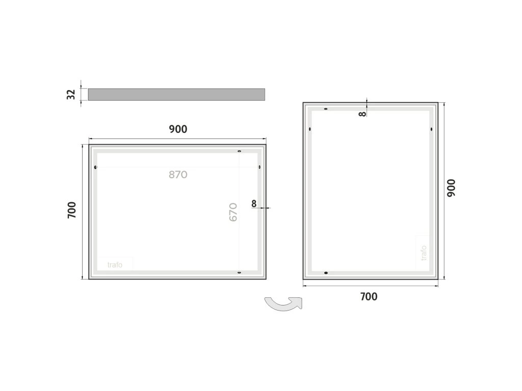 Obdélníkové zrcadlo s rámem s ostrými rohy a celoobvodovým svícením pro dokonalé a rovnoměrné osvětlení. Zrcadlo bez integrovaného vypínače je určené k připojení a ovládání nástěnným vypínačem. Barva světla zrcadla je pevně nastavena. Pro dosažení kvalitního a rovnoměrného svícení je použit akrylový difuzor, který zajišťuje měkký a harmonický rozptyl světla bez viditelných bodových zdrojů. LED diody jsou vkusně integrovány do rámu spolu s difuzorem, což přispívá k elegantnímu a čistému vzhledu zrcadla. Zrcadlo využívá nejmodernější LED čipy SMD 2835, které jsou známé svou vysokou svítivostí, energetickou úsporností a dlouhou životností. Hustota čipů 96/m, životnost 50 000 hodin. Parametry LED: Survival Factor = 1, Lumen Maintenance Factor 0,99 a Flicker Metric 0,02, pak zajišťují stabilní, bezblikavé a dlouhodobě konzistentní osvětlení. Nosná konstrukce zrcadla je vyrobena z masivního hliníkového rámu o rozměrech 32x19 mm, který zajišťuje vysokou pevnost a stabilitu. Stejně tak je z hliníku vyroben kryt zdroje a všech elektronických součástek. Sklo o tloušťce 5 mm je opatřeno bezpečnostní fólií, která chrání před zraněním v případě rozbití. Zrcadlo navíc disponuje stupněm ochrany proti vlhkosti IP44, což zaručuje spolehlivost i v prostředí s vyšší vlhkostí. Zrcadlo splňuje všechny české normy a je opatřeno českým certifikátem CE, který zaručuje jeho kvalitu a bezpečnost. Nabízí flexibilní možnosti upevnění, a to jak vertikálně, tak horizontálně, a je dodáváno včetně kompletní montážní sady a kabelové spojky s ochranou IP44. Pro zajištění bezpečné přepravy je zrcadlo pečlivě zabaleno a připraveno k expedici prostřednictvím kurýrní služby. Ovládání: Bez integrovaného spínače Ovládání nástěnným vypínačem Nastavení barvy světla: Barva světla pevně nastavena Barva světla: 4000 K (neutrální bílé světlo, ideální pro přesné a přirozené osvětlení) Funkce stmívání: Není instalováno Paměť nastavení: Není instalováno Konstrukce svícení: K rovnoměrnému rozptylu světla zrcadlo disponuje akrylovým matovaným difuzorem Integrace LED: Led diody jsou zabudované v rámu LED čip: Nejmodernější LED čipy SMD 2835 LED pásek - hustota čipů: 96/m Životnost LED čipů: Až 50 000 hodin Kvalita osvětlení LED: Survival Factor = 1; Lumen maintenance factor = 0,99; Flicker metric = 0,02 Materiál: Zrcadlové sklo, hliník Materiál konstrukce: Rám zrcadla a kryt zdroje jsou vyrobeny z hliníku Tloušťka skla: 5 mm Ochrana při rozbití: Bezpečnostní fólie Stupeň ochrany: IP 44 Certifikace: Český certifikát CE Umístění: Montáž na stěnu Možnost upevnění vertikálně i horizontálně Montážní příslušenství: Součástí balení je montážní sada a kabelová spojka s ochranou IP 44 Obal: Zabalené pro přepravu kurýrní službou Napětí: Vstupní napětí 220-240 V Výstupní napětí 12 V Příkon: 47 W, světelný tok: 3384 lm Rozměr: v: 700 mm š: 35 mm d: 900 mm Hmotnost: 10,4 kgDoplňkové parametry