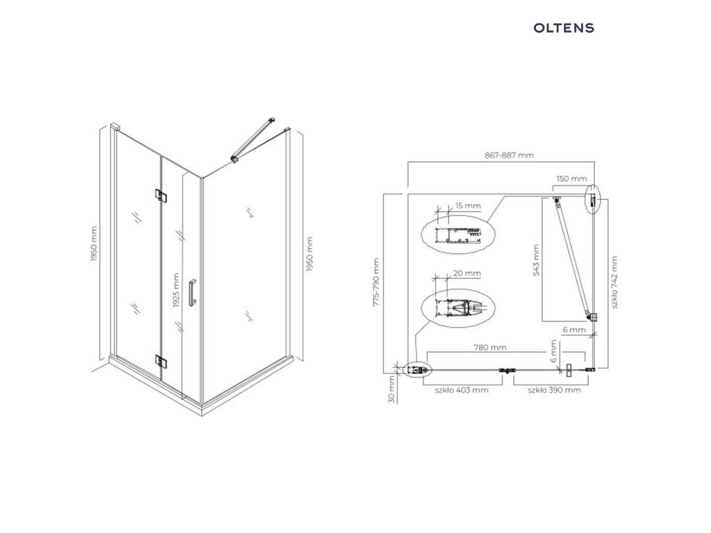 Oltens Hallan sprchový kout 90x80 cm, obdélníkový, dveře se zástěnou, matná černá / průhledné sklo, 20202300Doplňkové parametry