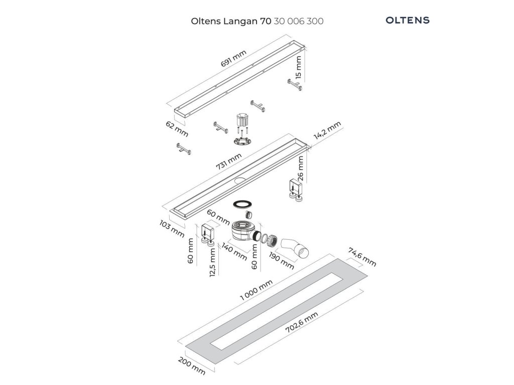 Oltens Langan 70 univerzální 2v1 sprchový odtokový žlab 70 cm s límcem, matná černá 30006300Doplňkové parametry