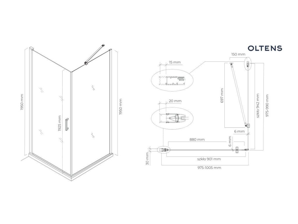 Oltens Rinnan sprchový kout 100x100 cm, čtvercový, dveře se zástěnou, matná černá/průhledné sklo, 20015300Doplňkové parametry