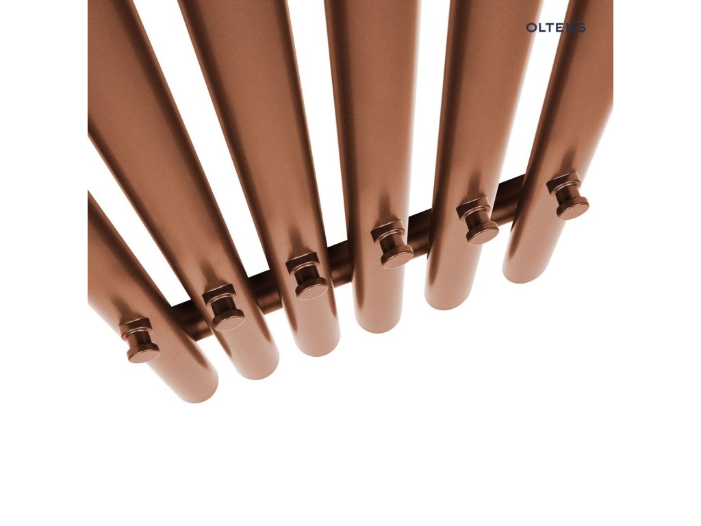 Elegantní elektrický koupelnový radiátor Oltens Stang E v luxusním kartáčovaném měděném provedení. Ideální volba do moderních koupelen, kde rychle ohřeje prostor a současně slouží jako praktický sušák na ručníky s 9 tyčemi. Radiátor je vybaven elektronickým termostatem pro přesnou regulaci teploty v rozmezí 30–70 °C a ochranou IP55 proti vlhkosti pro bezpečný provoz v koupelnovém prostředí.