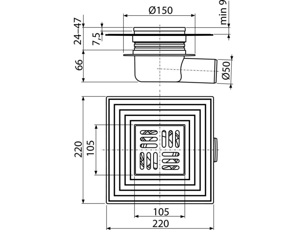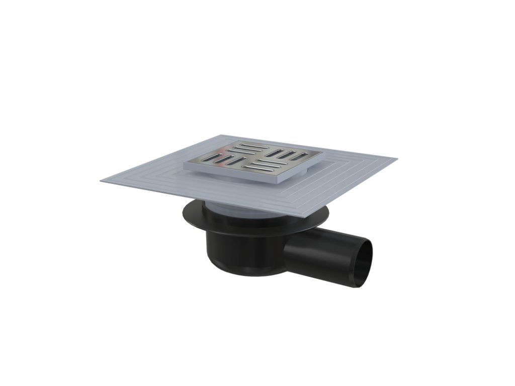 Podlahová vpust 105×105/50 mm boční, mřížka nerez, límec 2. úrovně izolace, suchá zápachová uzávěra APV26C