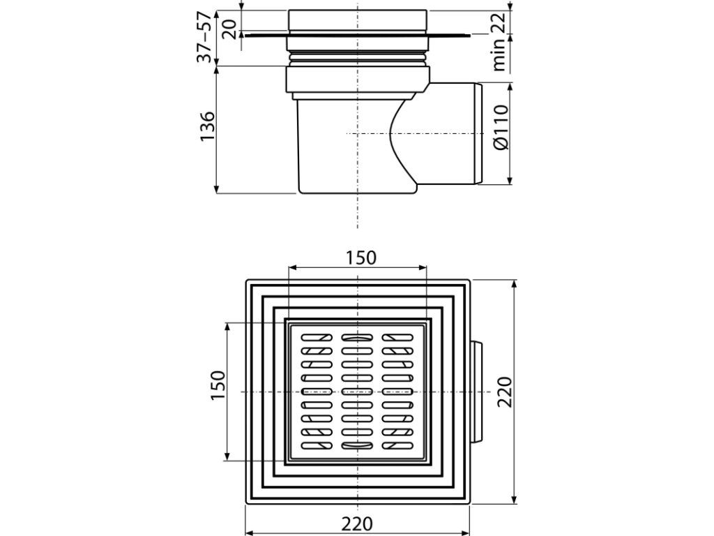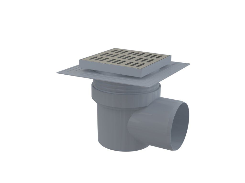 Podlahová vpust 150×150/110 mm boční, mřížka nerez, límec 2. úrovně izolace, vodní zápachová uzávěra APV12