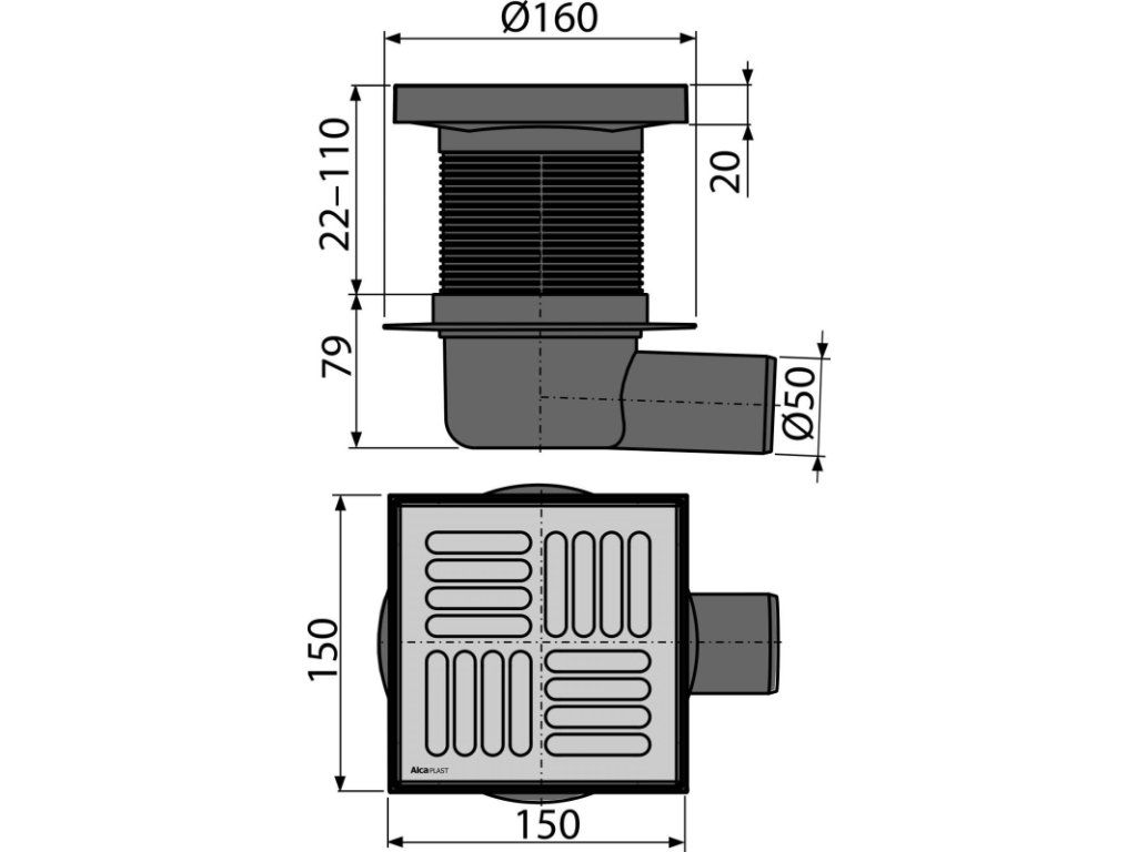 Podlahová vpust 150×150/50 mm boční, mřížka nerez, vodní zápachová uzávěra APV5411