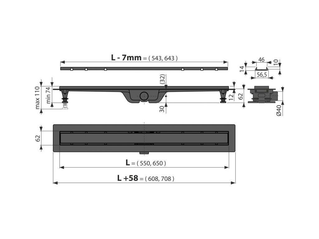 Podlahový žlab s okrajem pro oboustranný rošt, černá-mat APZ19BLACK-950