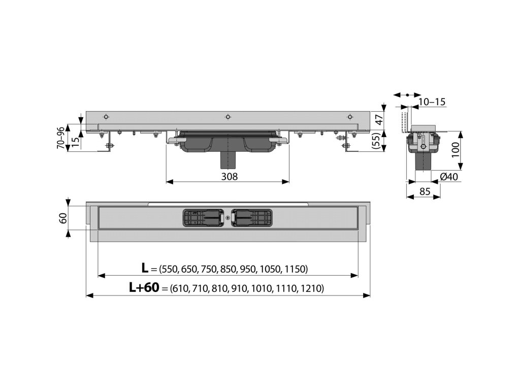 Podlahový žlab s okrajem pro perforovaný rošt a s nastavitelným límcem ke stěně, svislý odtok APZ1104-1050