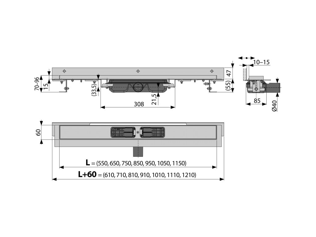 Podlahový žlab s okrajem pro perforovaný rošt a s nastavitelným límcem ke stěně APZ104-1050