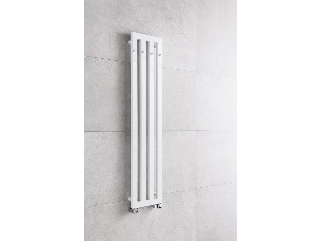 Hranatý radiátor do koupelny s háčky, vhodný i pro kombinované vytápění.