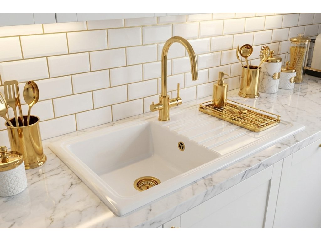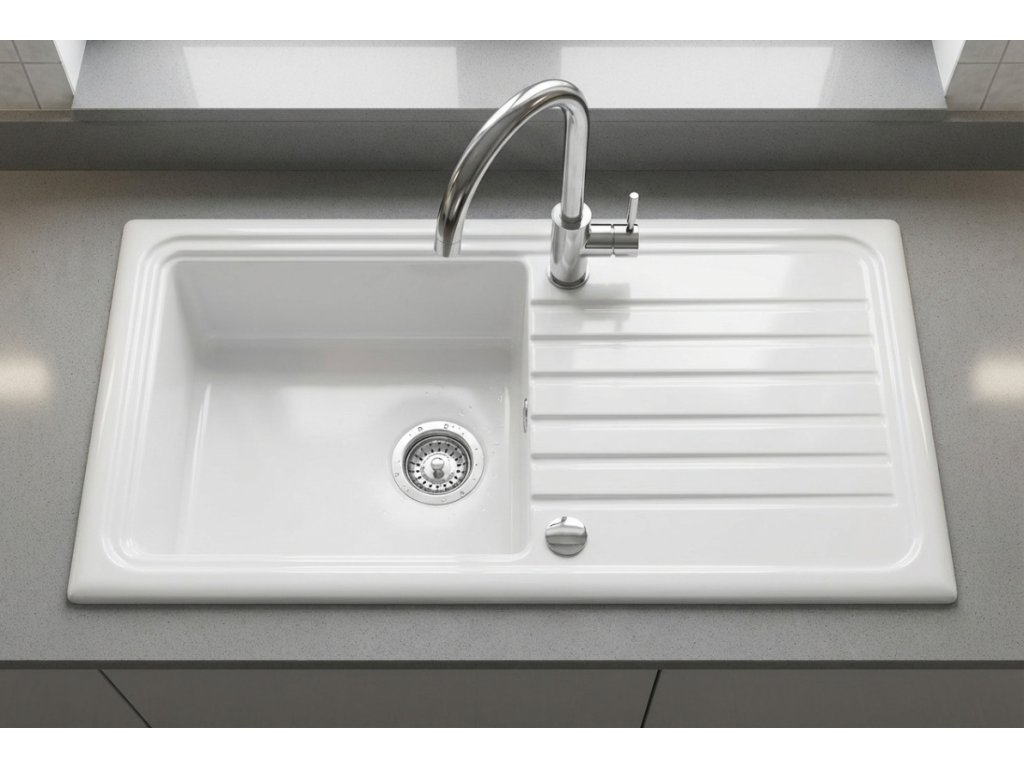 - zářivě bílý keramický dřez ve vysokém lesku s odkapávačem