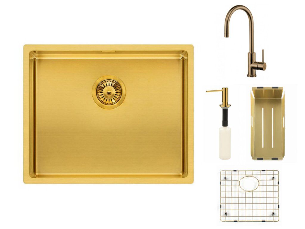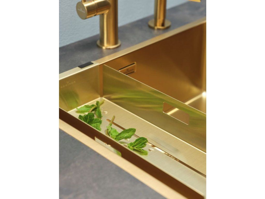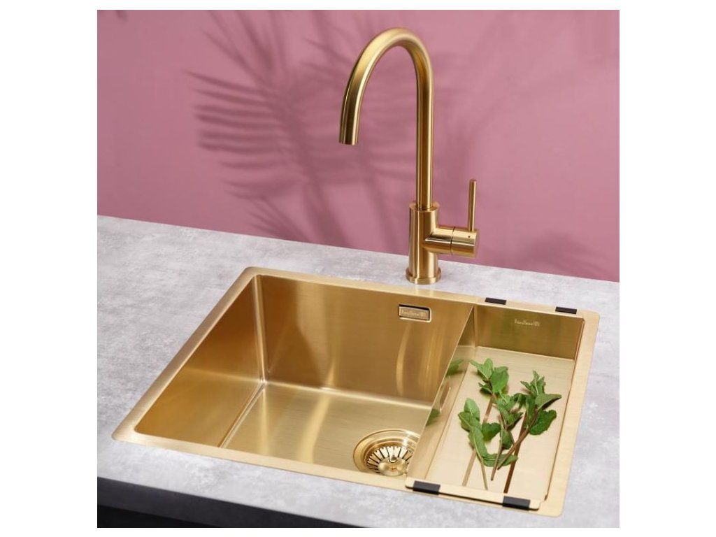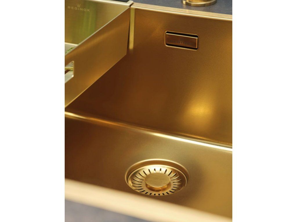 Luxusní zlatý set dřezu včetně příslušenství vyrábí lídr na trhu mezi dřezy prestižní firma Reginox. Společnost Reginox je na trhu více než 39 let, klade důraz na design, kvalitu i životní prostředí. Nerezový dřez Miami 500 Gold (R30745) je součástí designové řady barevných dřezů Regi- colour. Set dřezu ve zlaté barvě se dokonale hodí do kuchyně v klasickém, glamour, retro, rustikálním nebo anglickém stylu. Dodá interiéru originální charakter.