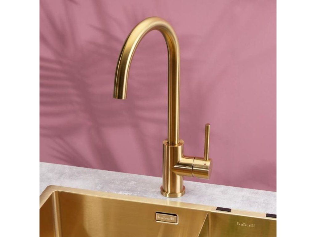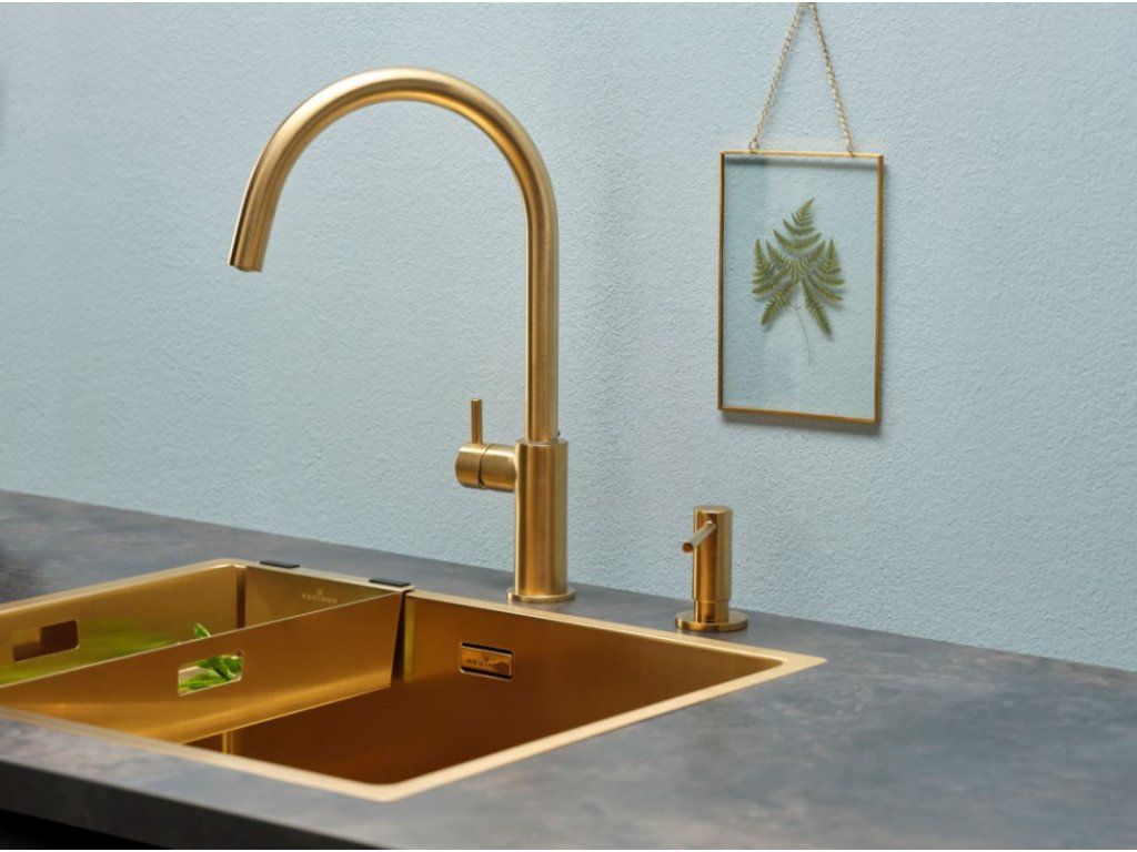 Kuchyňská baterie Cano Gold (R30509), kartáčovaný nikl- zlato. Tato kuchyňská baterie doplňuje tzv. řadu stylové mosazi, aby dokonale ladila s dřezem. Ideální kombinace stylu, kvality a výkonu.