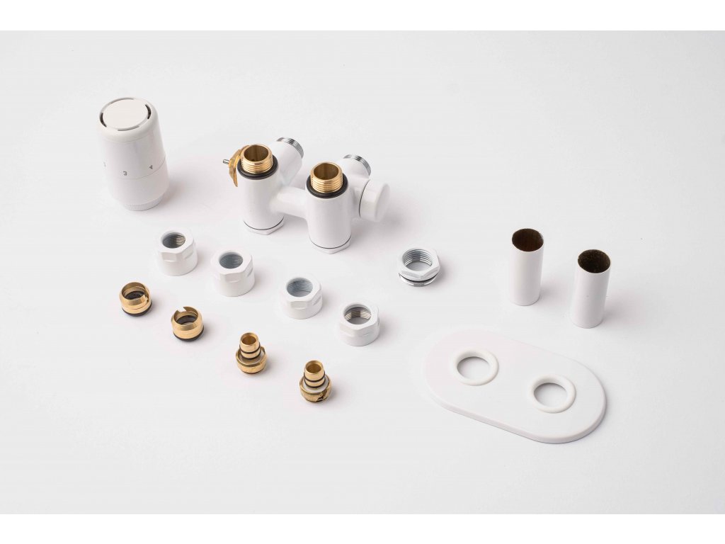 Kompletní sada obsahuje kromě ventilu také krycí rozety a svěrné šroubení pro připojení na měď potrubí 15 mm a Alupex 16 mm.